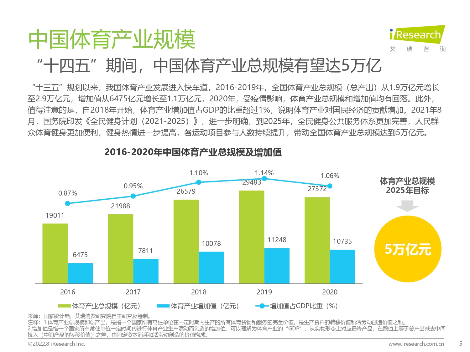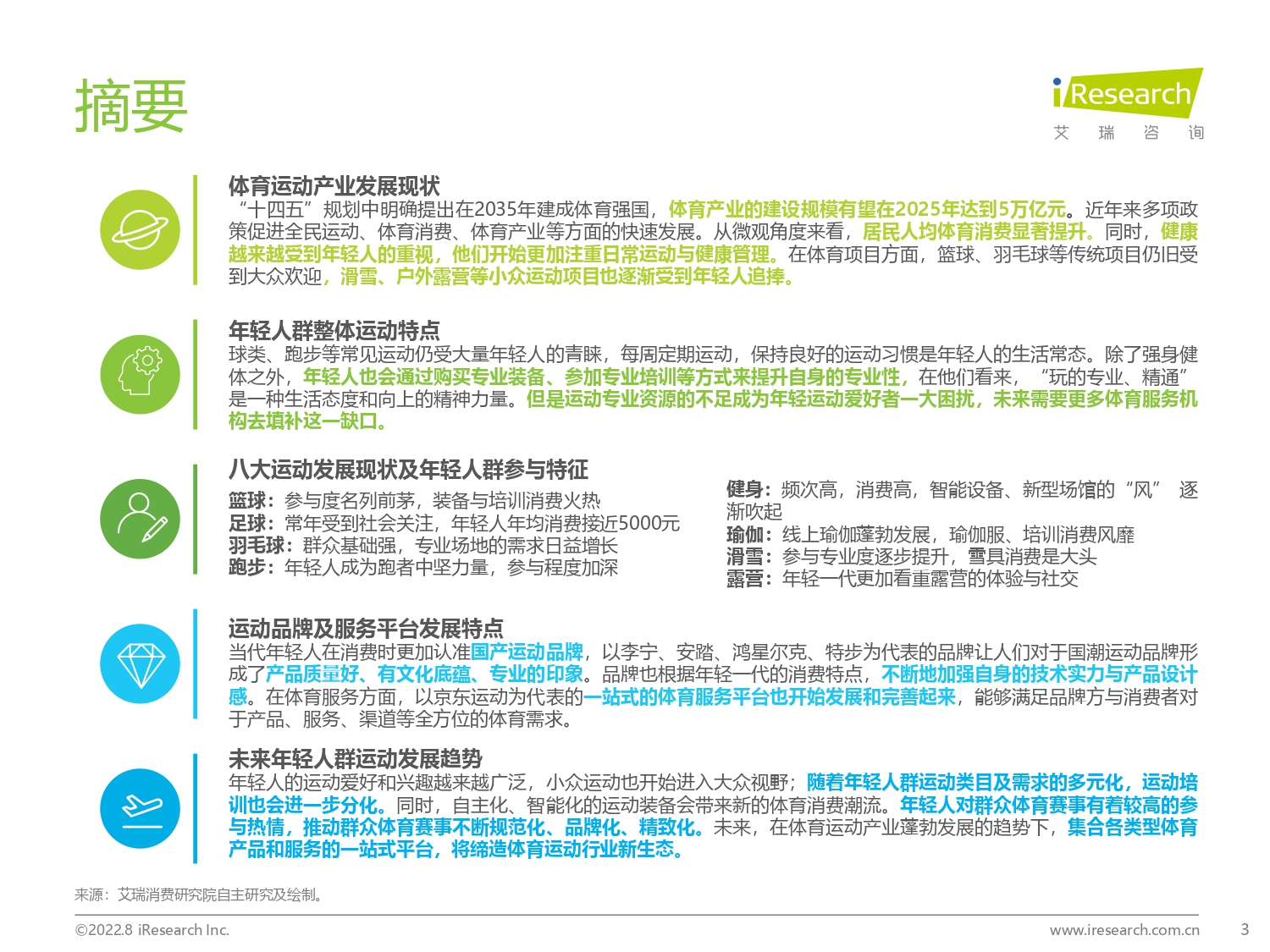 “十四五”规划中明确提出在2035年建成体育强国,体育产业的建设规模有望在2025年达到5万亿元。近年来多项政策促进全民运动、体育消费、体育产业等方面的快速发展。 从微观角度来看,居民人均体育消费显著提升。同时,健康越来越受到年轻人的重视,他们开始更加注重日常运动与健康管理。在体育项目方面,篮球、羽毛球等传统项目仍旧受到大众欢迎,滑雪、户外露营等小众运动项目也逐渐受到年轻人追捧。 那么未来年轻人群运动发展趋势如何? 年轻人的运动爱好和兴趣越来越广泛,小众运动也开始进入大众视野;随着年轻人群运动类目及需求的多元化,运动培训也会进一步分化。同时,自主化、智能化的运动装备会带来新的体育消费潮流。 年轻人对群众体育赛事有着较高的参与热情,推动群众体育赛事不断规范化、品牌化、精致化。未来,在体育运动产业蓬勃发展的趋势下,集合各类型体育产品和服务的一站式平台,将缔造体育运动行业新生态。