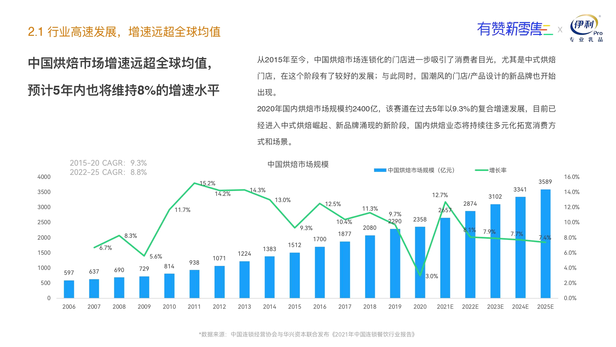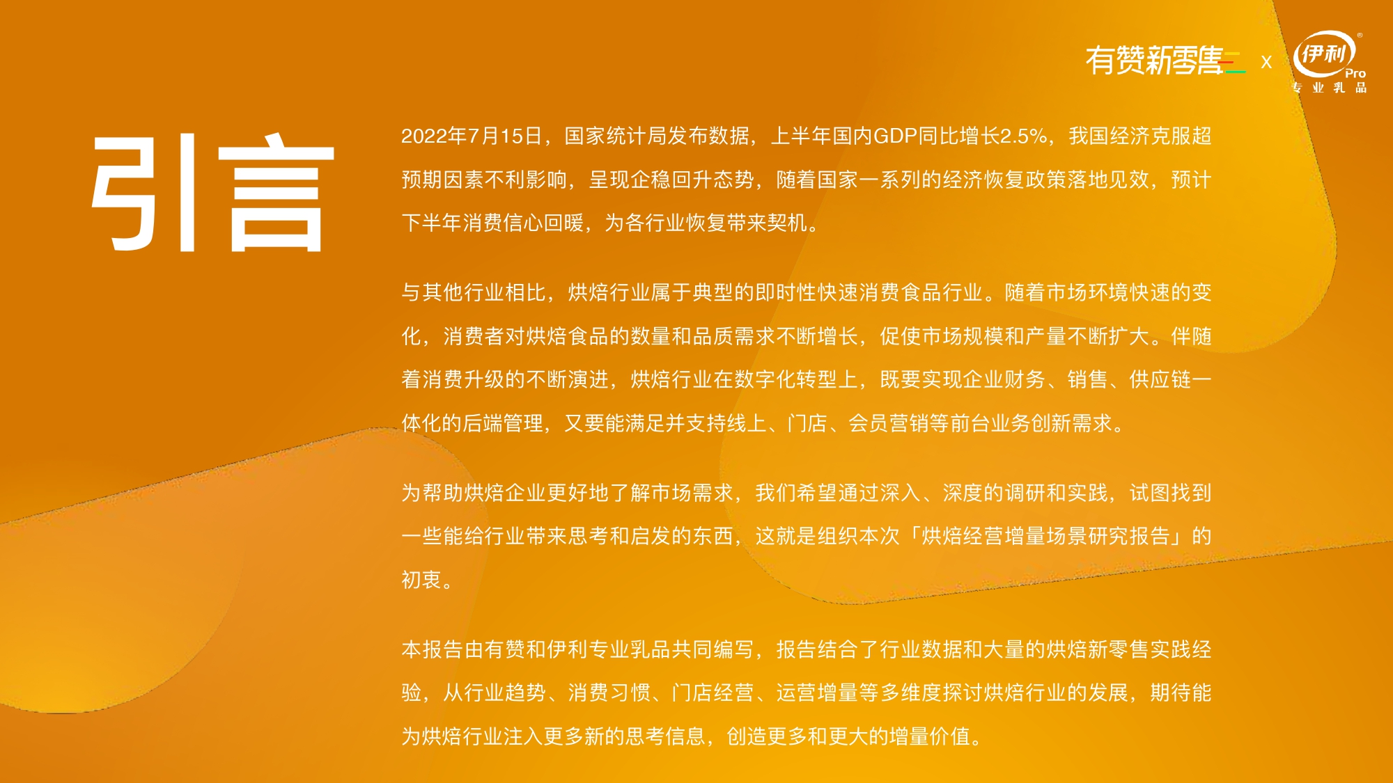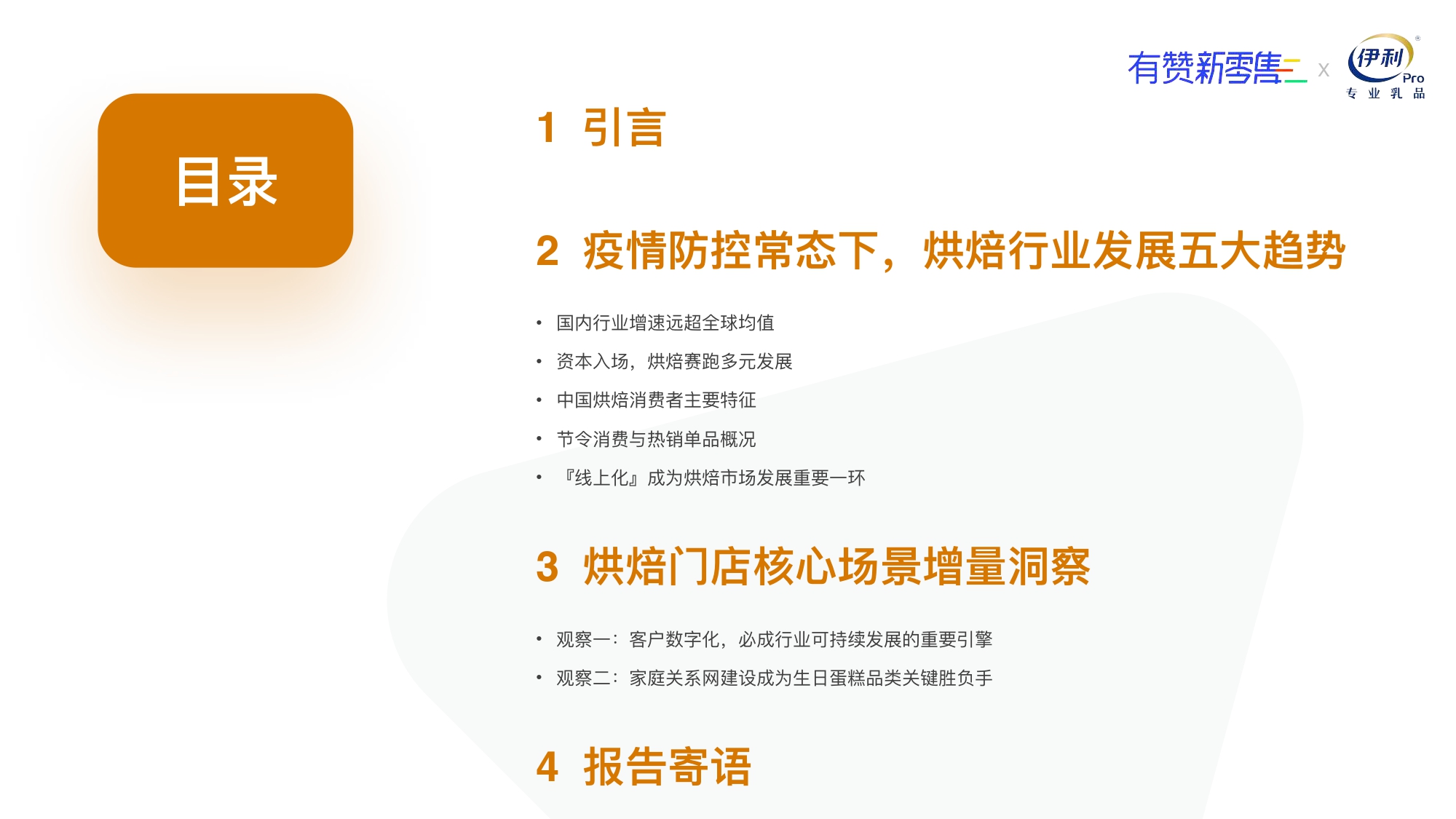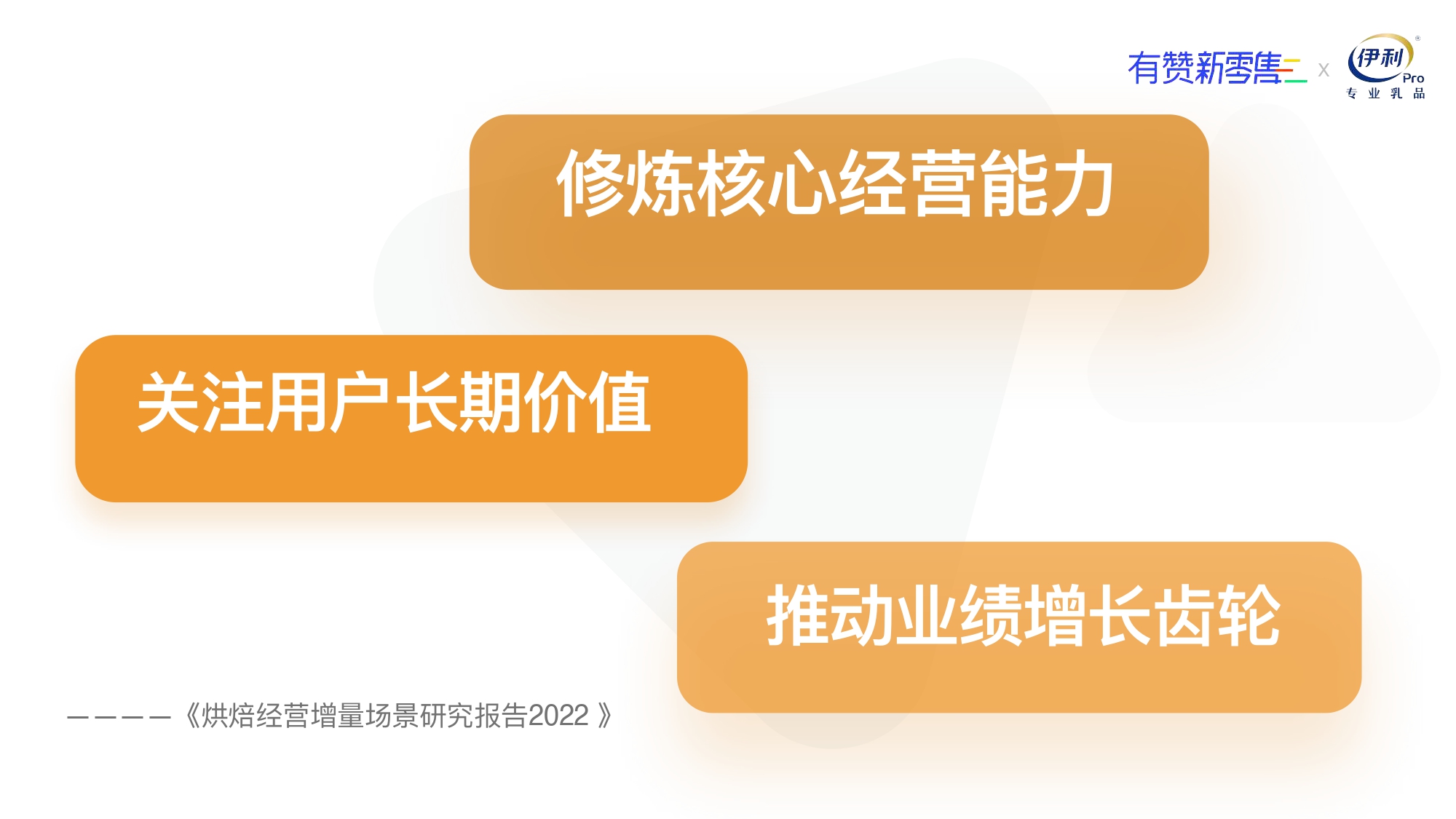 有赞联合伊利专业乳品共同发布《烘焙经营增量场景研究报告2022》,从行业趋势、人群消费习惯、门店经营场景、运营增量等多个维度探讨烘焙行业的发展思路,旨在帮助烘焙从业者更好地了解行业现状,洞察这一赛道在变革中面临的新机遇。 眼下,烘焙市场的头部效应仍未形成,红利期还在。无论未来充满多少变数,对于烘焙玩家来说,修炼核心经营能力、关注用户长期价值始终都是推动业绩增长齿轮的关键。 更多细节内容可查看完整报告获得~