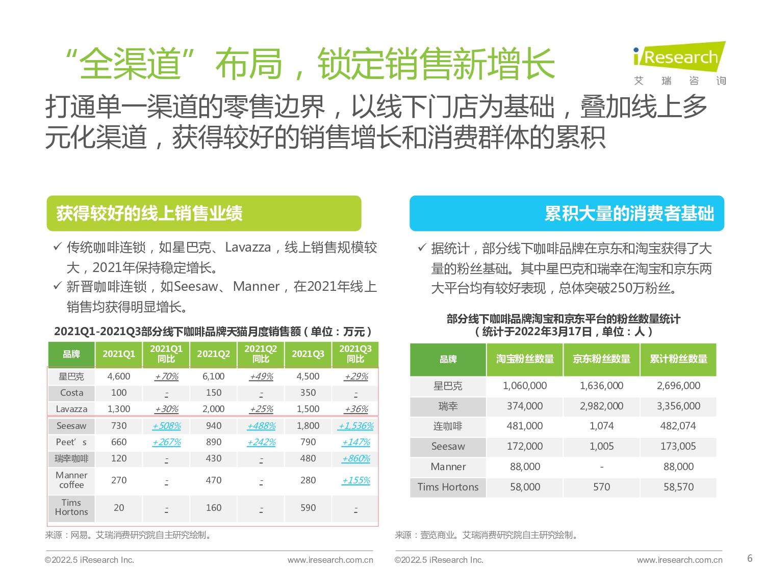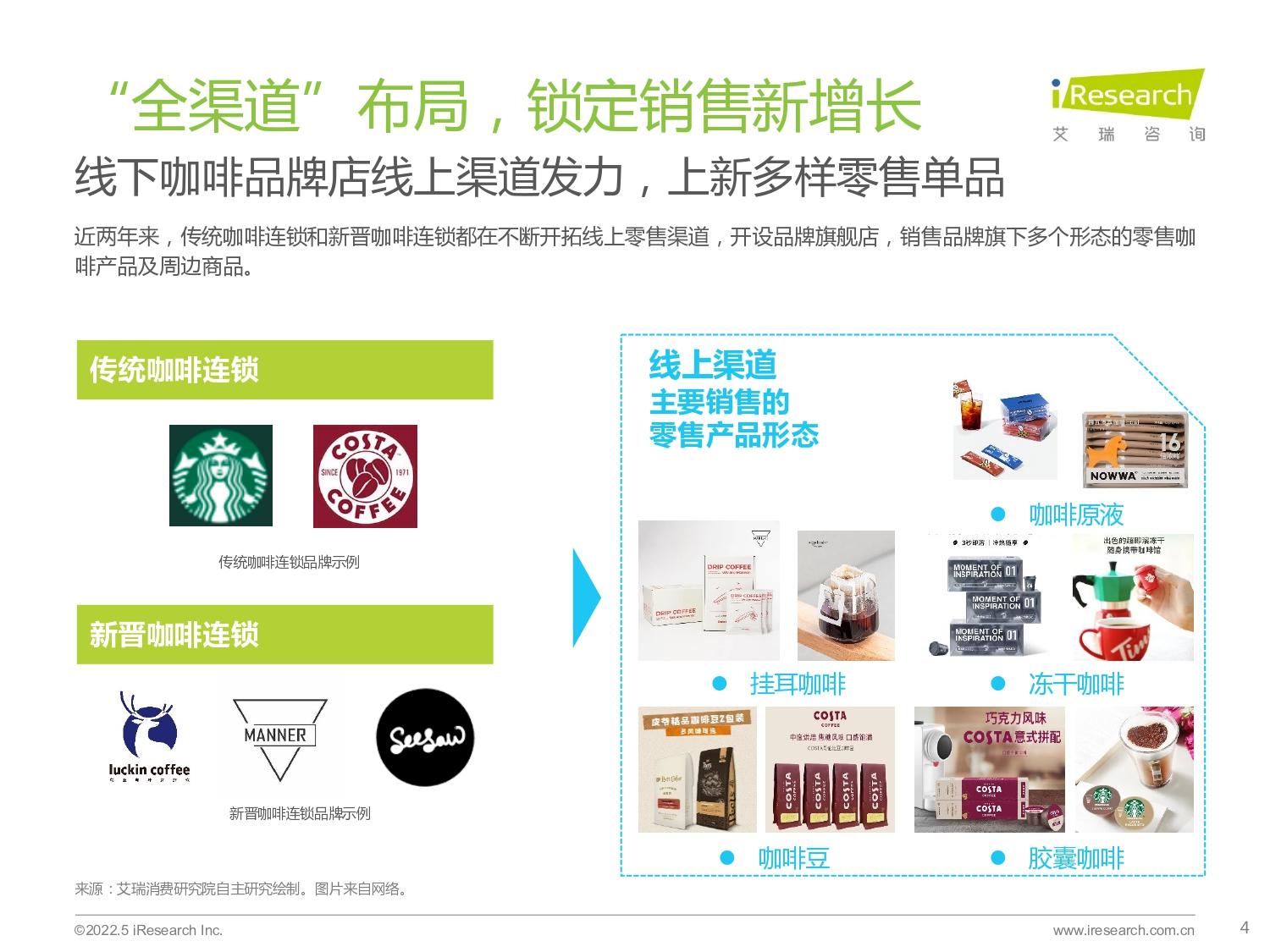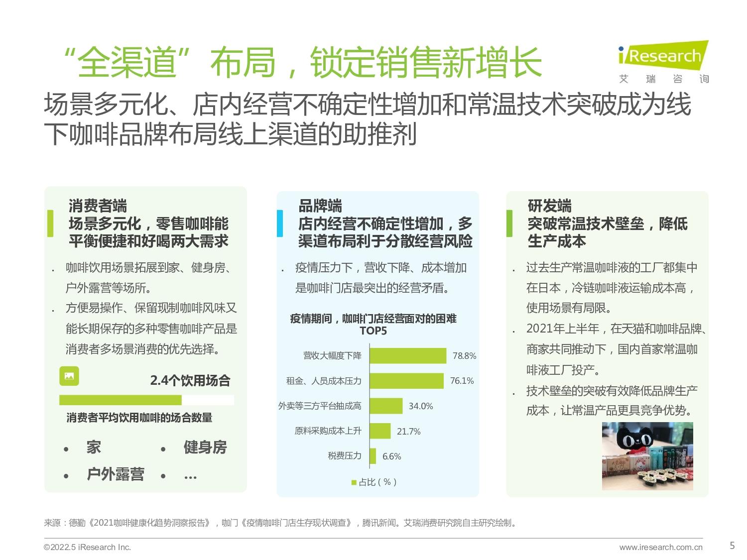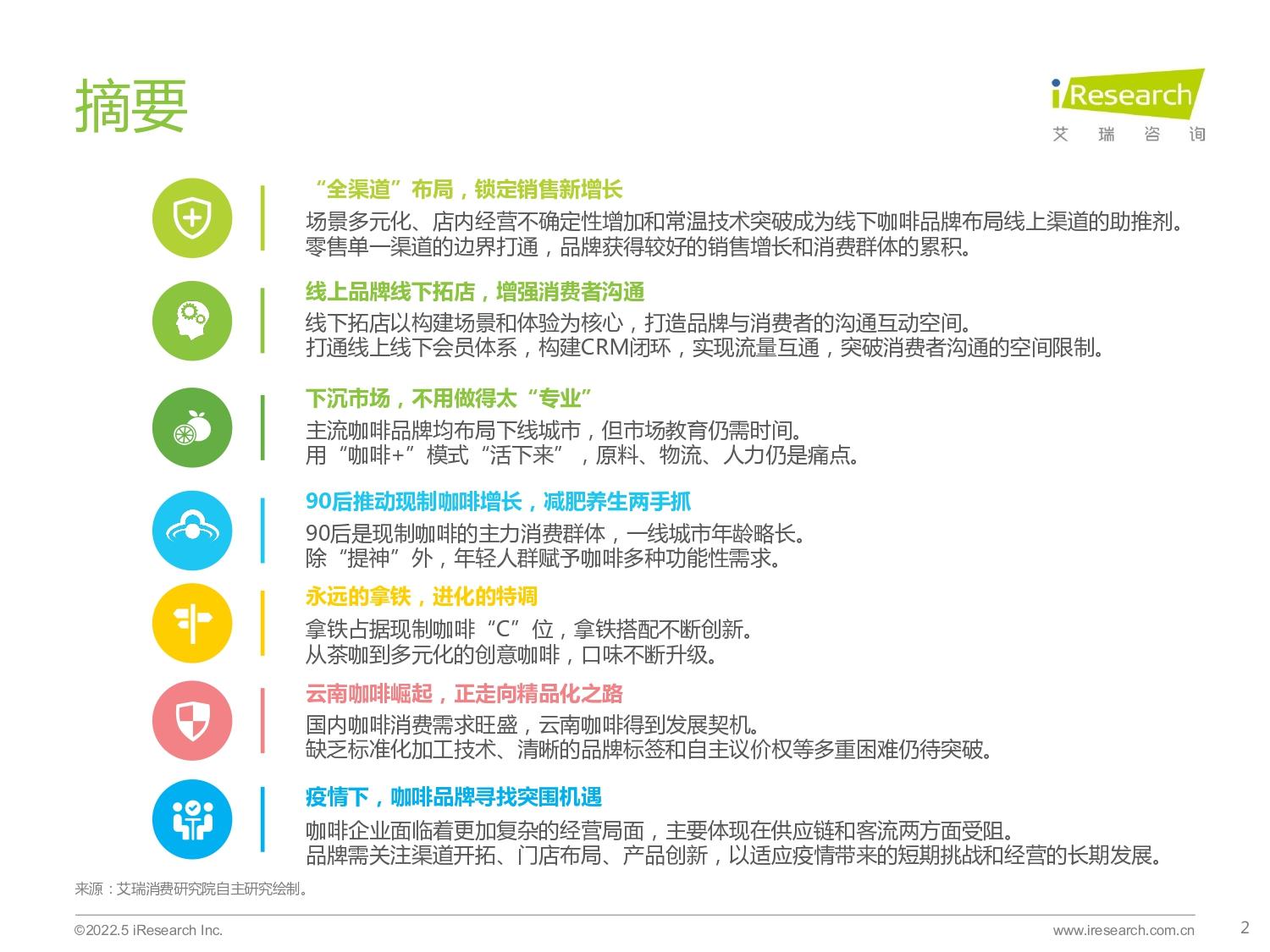 1.“全渠道”布局,锁定销售新增长 场景多元化、店内经营不确定性增加和常温技术突破成为线下咖啡品牌布局线上渠道的助推剂。 2.线上品牌线下拓店,增强消费者沟通 打通线上线下会员体系,构建CRM闭环,实现流量互通,突破消费者沟通的空间限制。 3.下沉市场,不用做得太“专业” 主流咖啡品牌均布局下线城市,但市场教育仍需时间。 用“咖啡+”模式“活下来”,原料、物流、人力仍是痛点。 4.90后推动现制咖啡增长,减肥养生两手抓 90后是现制咖啡的主力消费群体,一线城市年龄略长。 除“提神”外,年轻人群赋予咖啡多种功能性需求。 5.永远的拿铁,进化的特调 拿铁占据现制咖啡“C”位,拿铁搭配不断创新。 从茶咖到多元化的创意咖啡,口味不断升级。 6.云南咖啡崛起,正走向精品化之路 国内咖啡消费需求旺盛,云南咖啡得到发展契机。 7.疫情下,咖啡品牌寻找突围机遇 咖啡企业面临着更加复杂的经营局面