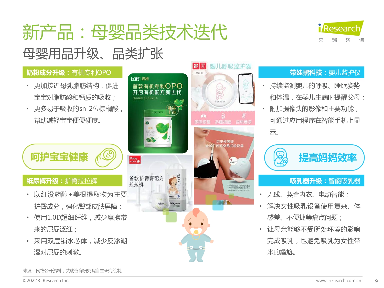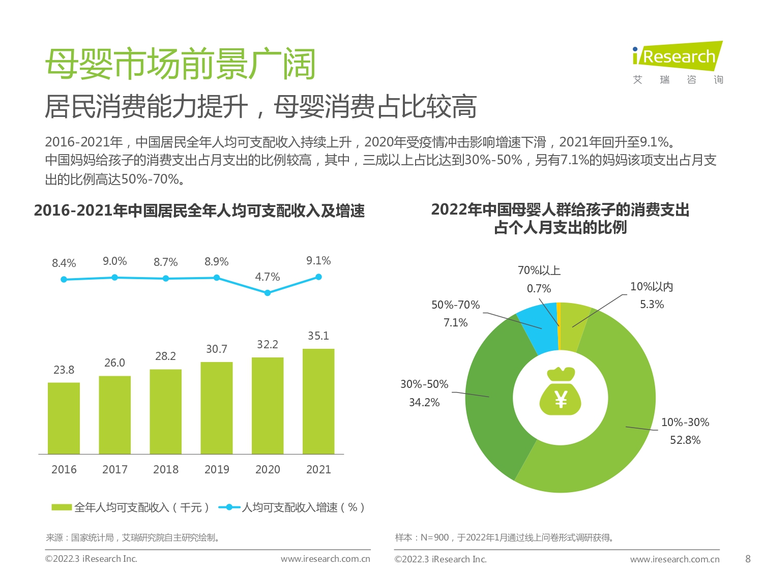 2016-2021年,中国居民全年人均可支配收入持续上升,2020年受疫情冲击影响增速下滑,2021年回升至9.1%。中国妈妈给孩子的消费支出占月支出的比例较高,其中,三成以上占比达到30%-50%,另有7.1%的妈妈该项支出占月支出的比例高达50%-70%。居民消费能力提升,母婴市场前景广阔。 母婴市场已经进入新消费时期,衍生出关于宝宝和妈妈的多样细分赛道,在这种背景下,商家该如何把握住母婴行业的新机遇?