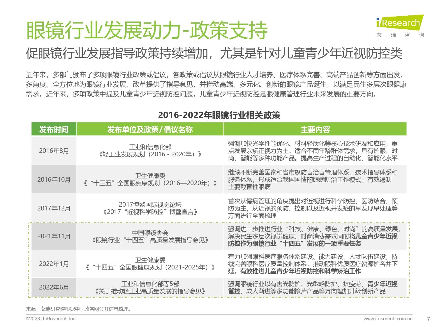 2022年,全国眼镜产品零售市场规模777亿元,镜片、镜架零售市场规模分别为340亿元、278亿元。从发展趋势来看,受益于消费升级等因素,未来镜片、镜架市场仍保持增长态势,预计2026年国内镜片、镜架零售市场规模将分别达到574亿元、392亿元。 受电子产品使用、网课时长等因素影响,儿童青少年近视率持续升高,青控眼镜产品渐成为眼镜产业布局的重点方向。 消费者对眼镜需求从功能性向舒适性、时尚性递进,配镜的核心需求是视力管理。不同人群对于眼镜的需求也不尽相同。 本报告总结了眼镜行业发展的4大趋势,查看完整报告获取更多细节信息~