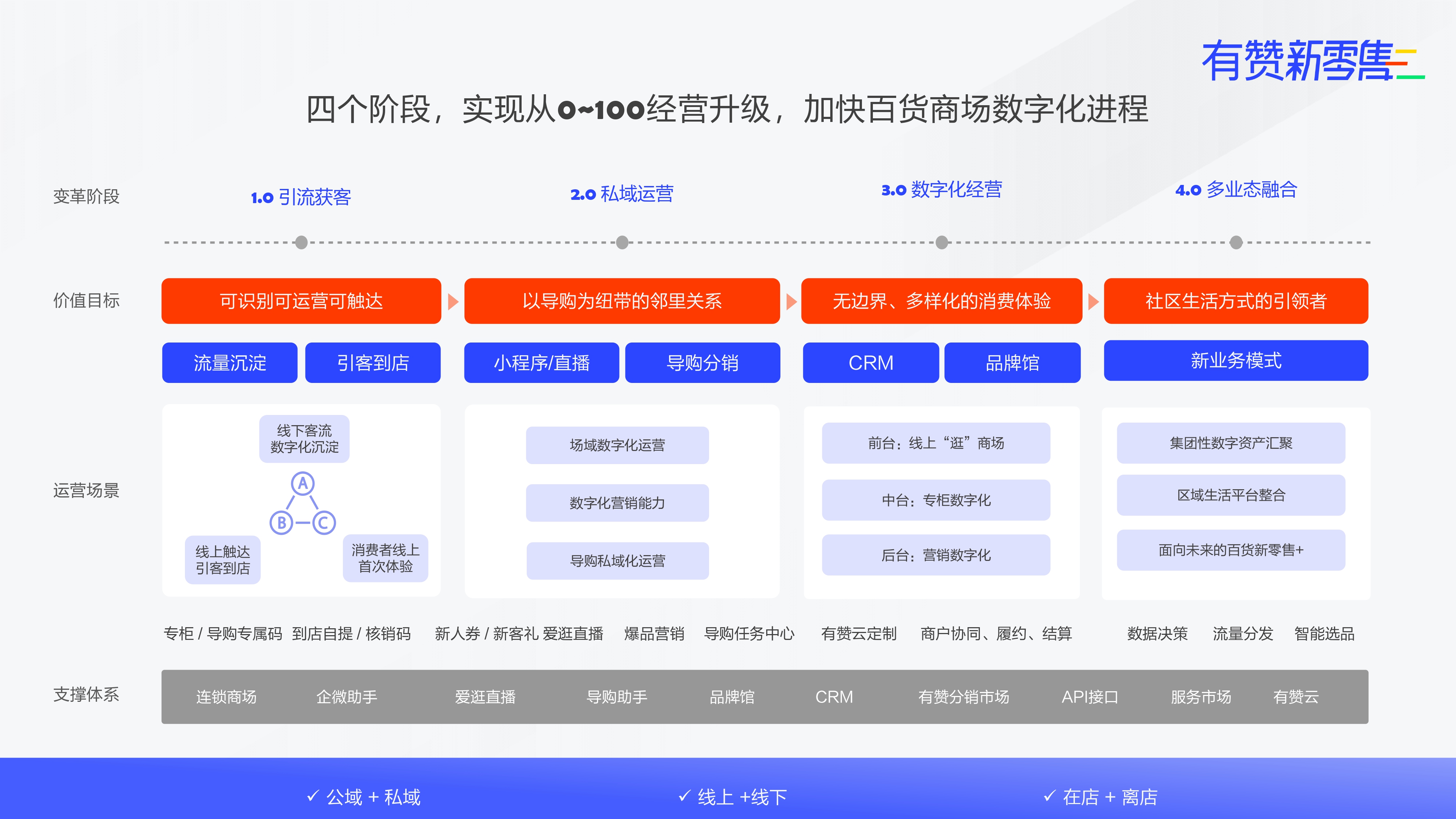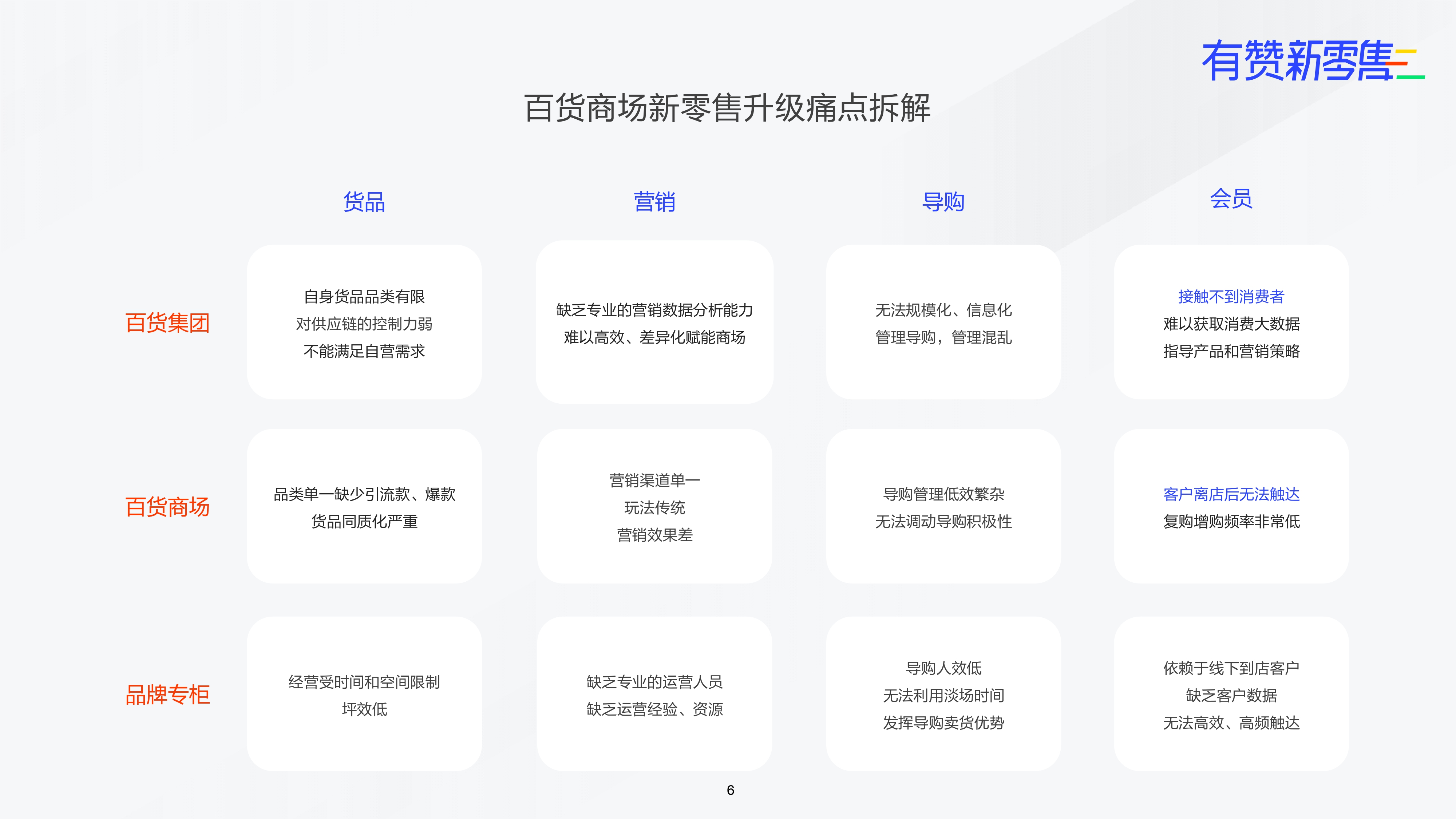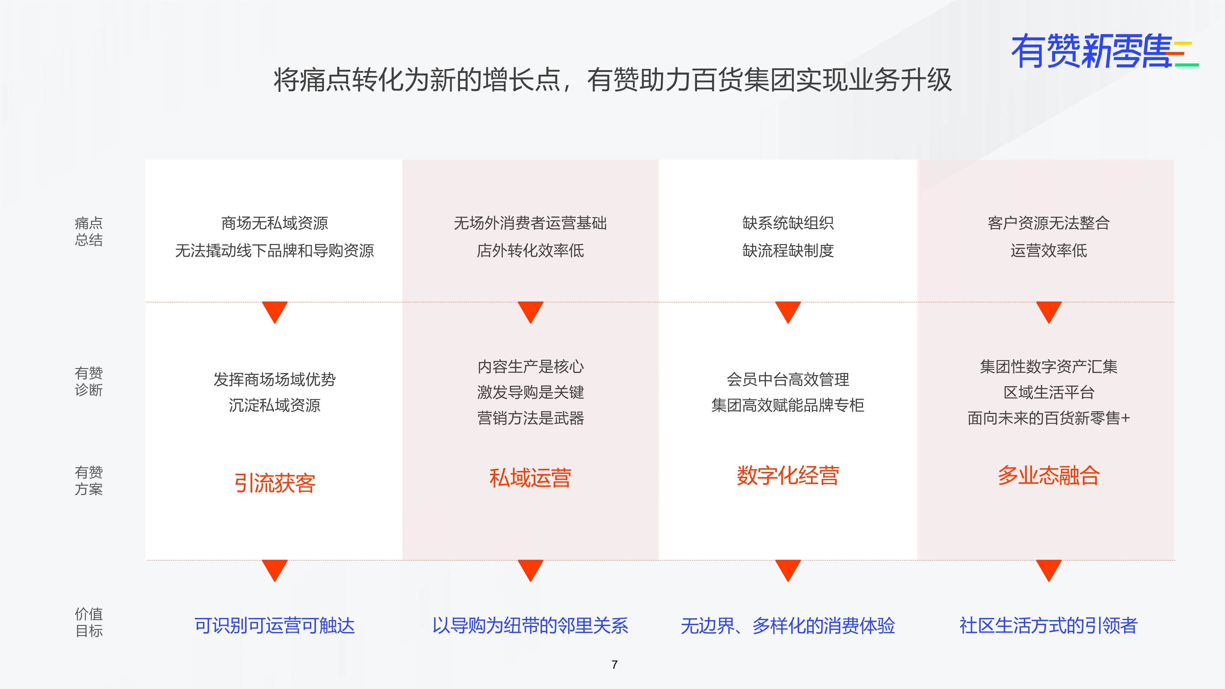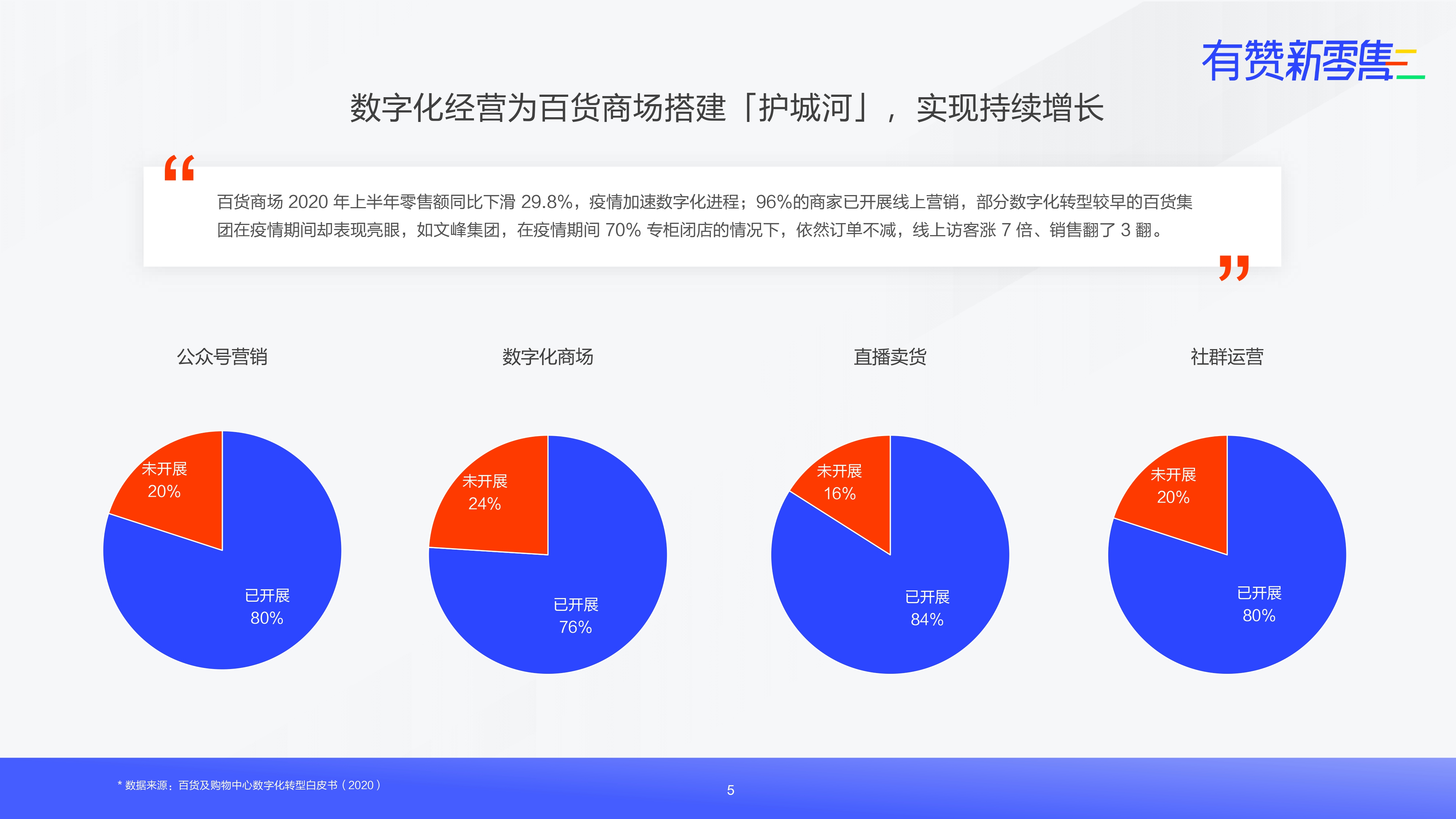百货商场2020 年上半年零售额同比下滑29.8%,疫情加速数字化进程。96% 的商家已开展线上营销,部分数字化转型较早的百货集团在疫情期间却表现亮眼。 例如文峰集团在疫情期间 70% 专柜闭店的情况下,依然订单不减,线上访客涨 7 倍、销售翻了 3 翻。 百货行业进入新零售时代,挑战与机遇并存。 1.商场无私域资源,无法撬动线下品牌和导购资源; 2.无场外消费者运营基础,店外转化效率低; 3.缺系统缺组织,缺流程缺制度; 4.客户资源无法整合,运营效率低; 针对这4大痛点,有赞给出了完整的新零售解决方案,可查看完整报告获取更多信息~