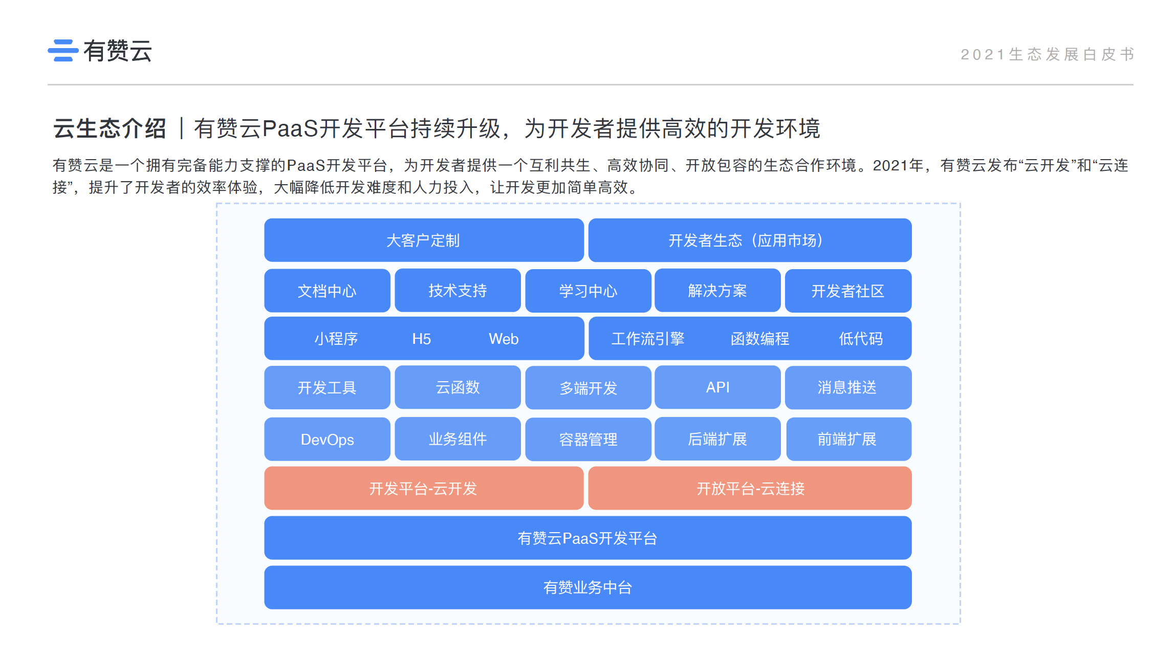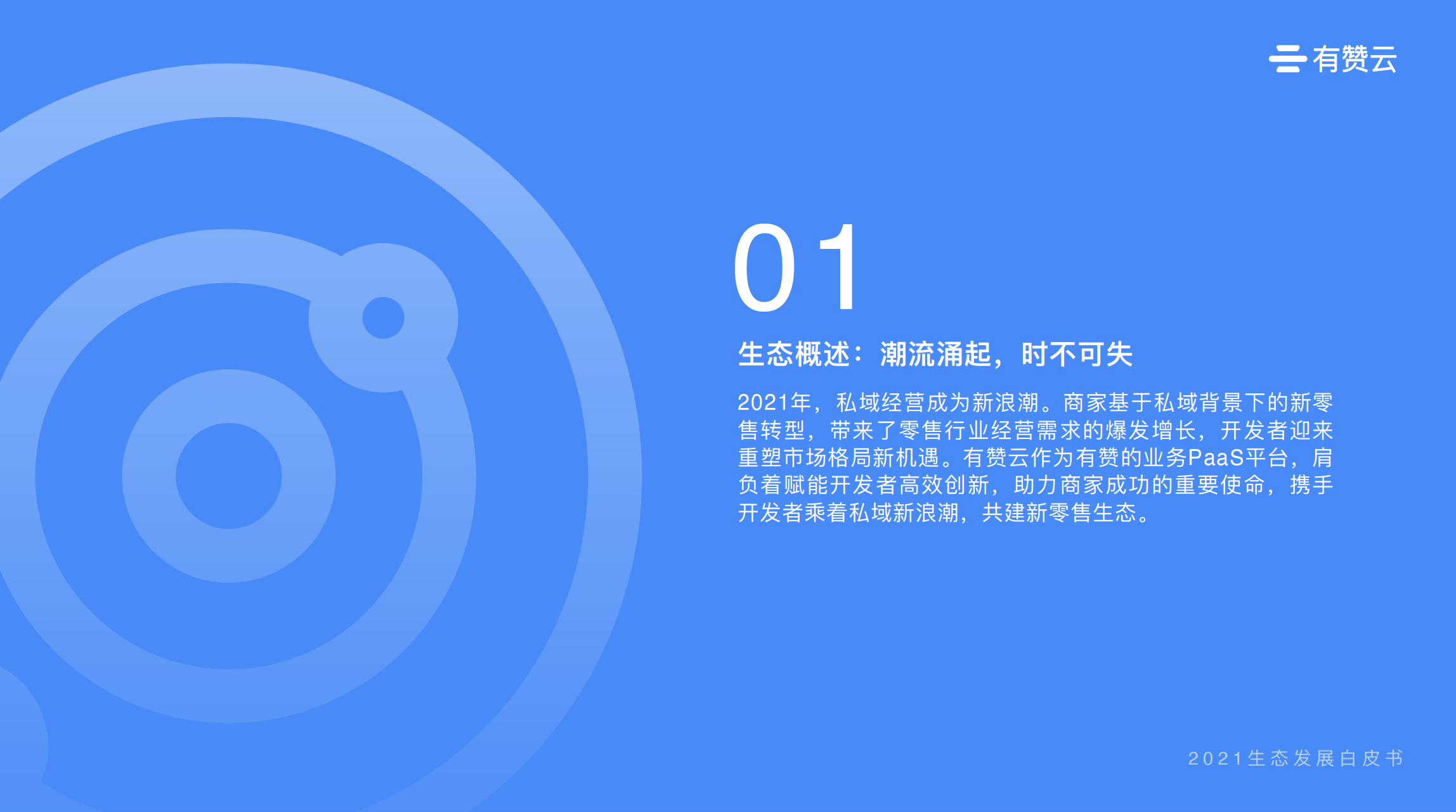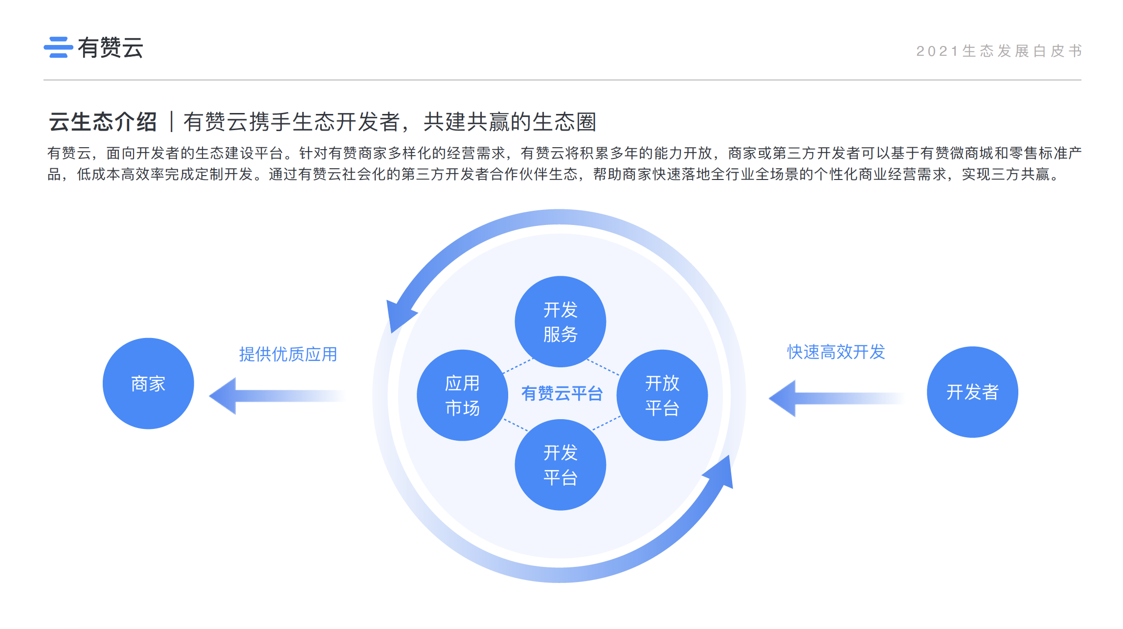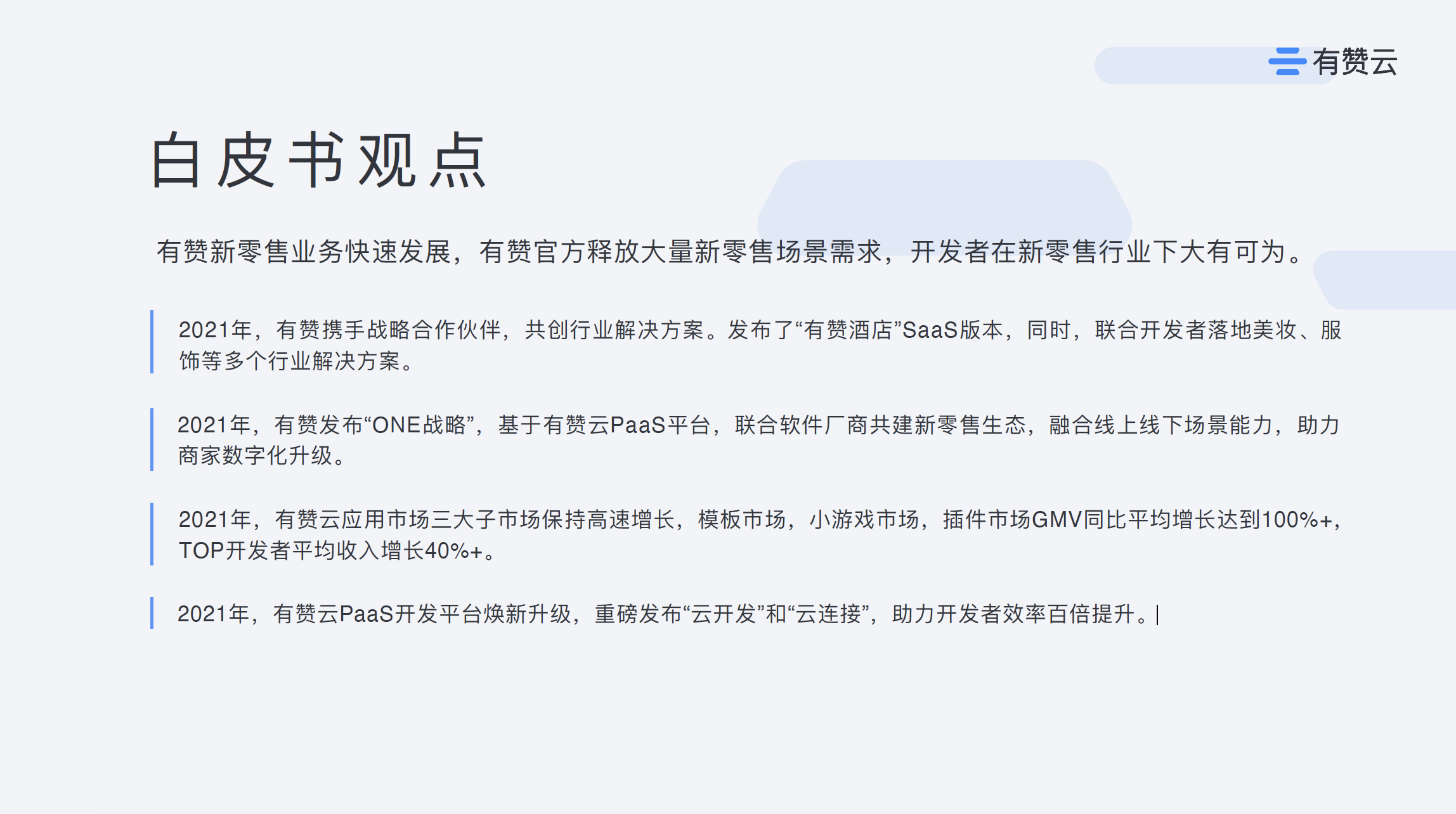 有赞新零售业务快速发展,有赞官⽅释放⼤量新零售场景需求,开发者在新零售⾏业下⼤有可为。 2021年,有赞携⼿战略合作伙伴,共创⾏业解决⽅案。发布了“有赞酒店”SaaS版本,同时,联合开发者落地美妆、服饰等多个⾏业解决⽅案。 2021年,有赞发布“ONE战略”,基于有赞云PaaS平台,联合软件⼚商共建新零售⽣态,融合线上线下场景能⼒,助⼒商家数字化升级。 2021年,有赞云应⽤市场三⼤⼦市场保持⾼速增⻓,模板市场,⼩游戏市场,插件市场GMV同⽐平均增⻓达到100%+,TOP开发者平均收⼊增⻓40%+。 2021年,有赞云PaaS开发平台焕新升级,重磅发布“云开发”和“云连接”,助⼒开发者效率百倍提升。