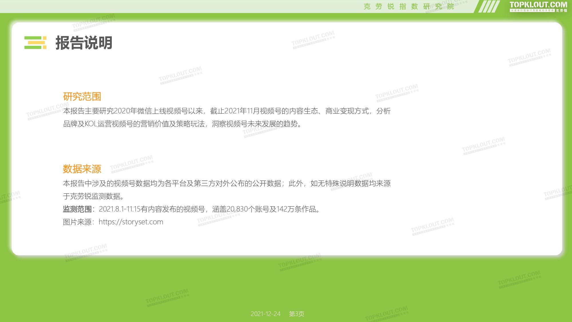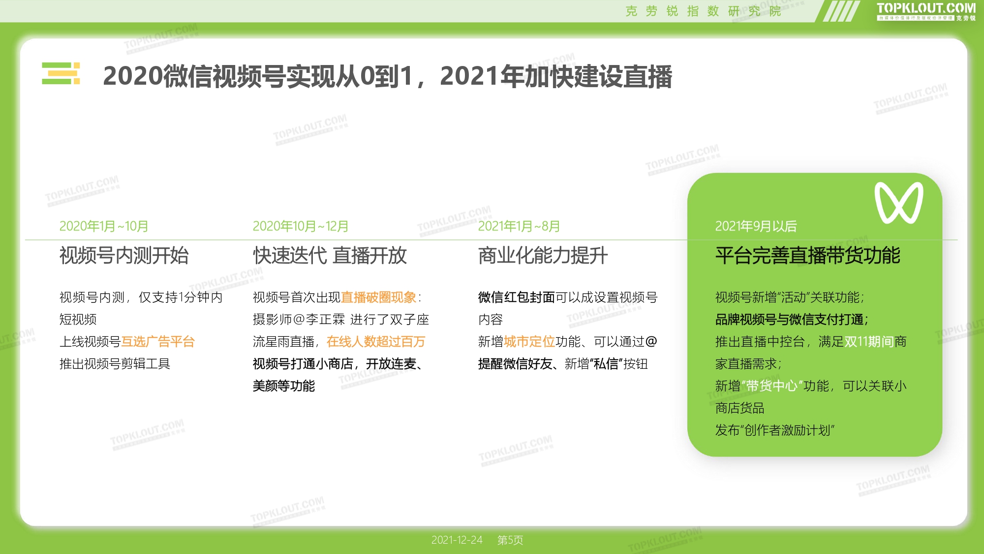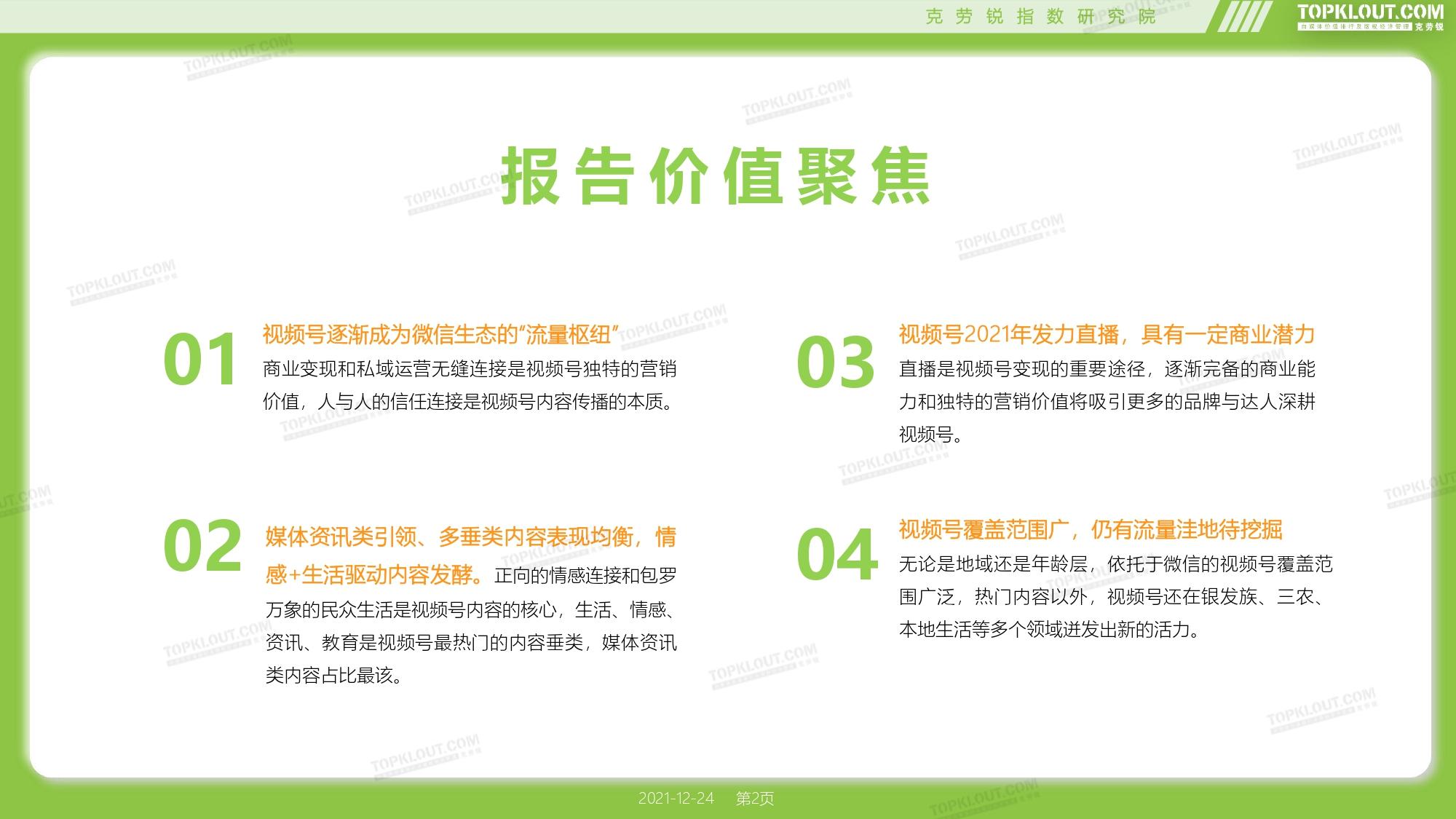 微信视频号生态洞察: 1.视频号逐渐成为微信生态的“流量枢纽” 商业变现和私域运营无缝连接是视频号独特的营销价值,人与人的信任连接是视频号内容传播的本质。 2.媒体资讯类引领、多垂类内容表现均衡,情感+生活驱动内容发酵。 正向的情感连接和包罗万象的民众生活是视频号内容的核心,生活、情感、资讯、教育是视频号最热门的内容垂类,媒体资讯类内容占比最高。 3.视频号2021年发力直播,具有一定商业潜力 直播是视频号变现的重要途径,逐渐完备的商业能力和独特的营销价值将吸引更多的品牌与达人深耕视频号。 4.视频号覆盖范围广,仍有流量洼地待挖掘 无论是地域还是年龄层,依托于微信的视频号覆盖范围广泛,热门内容以外,视频号还在银发族、三农、本地生活等多个领域迸发出新的活力。