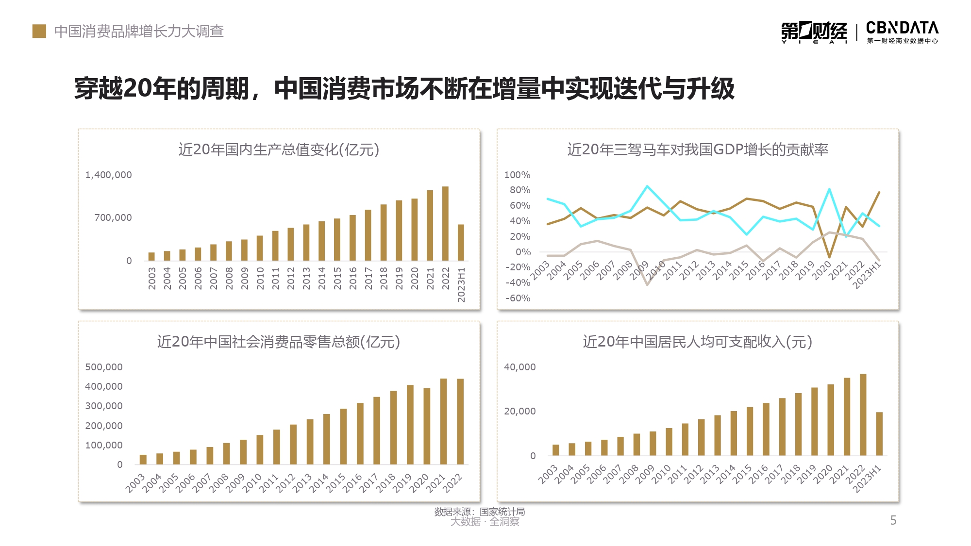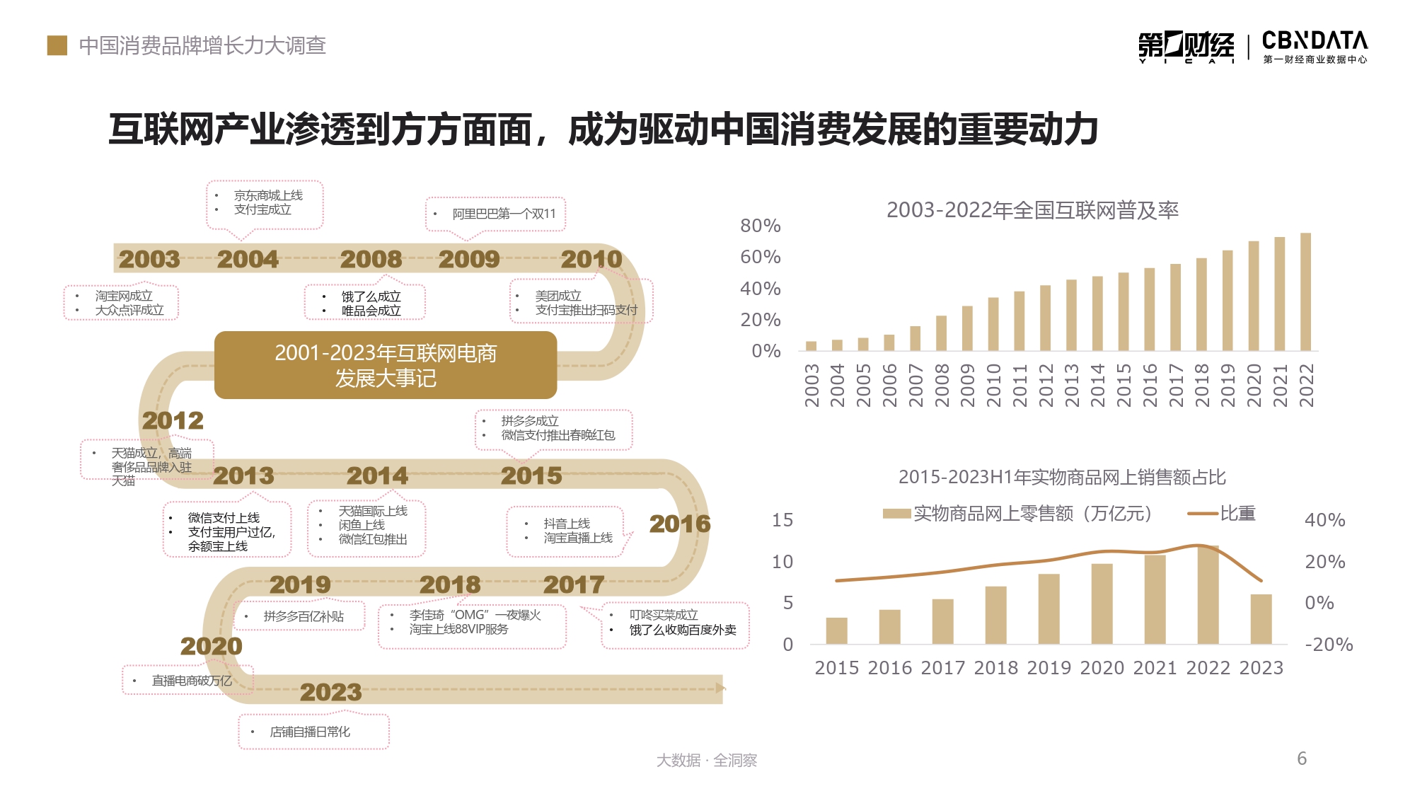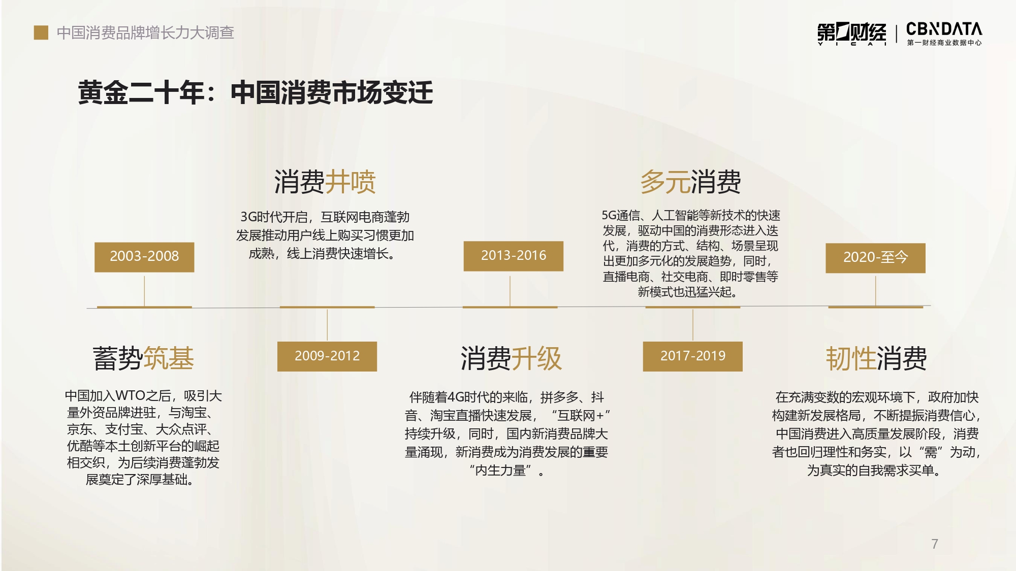 过去二十年,是中国互联网产业迅速、全面、深度渗透到中国消费生活的二十年。 从“3G突破”到“4G同步”,再到“5G引领”,数字经济的发展打开了“互联网+商业”的无限想象空间,改变了人们从社交到娱乐的生活习惯、从购物到饮食的消费习惯。从沿海到内陆,从一线城市到更为庞大的县域市场,中国消费持续提质升级,开始了一轮又一轮变革。 过去二十年,也是中国消费市场蓬勃发展的二十年。 国际品牌先后入场,国产品牌一路疾驰,伴随着新技术、新媒介、新平台的出现,中国消费经历了从渐起微澜到波涛壮阔的20年。 2023年,消费行业迎来拐点,我们比以往看到了更多确定性,但同时也意识到消费市场的新周期和新故事才刚刚开始。因此,我们回望过去二十年的消费变迁,从中找到驱动消费市场发展的核心事件、核心品牌、核心人群,助力中国消费产业实现持续跃增。