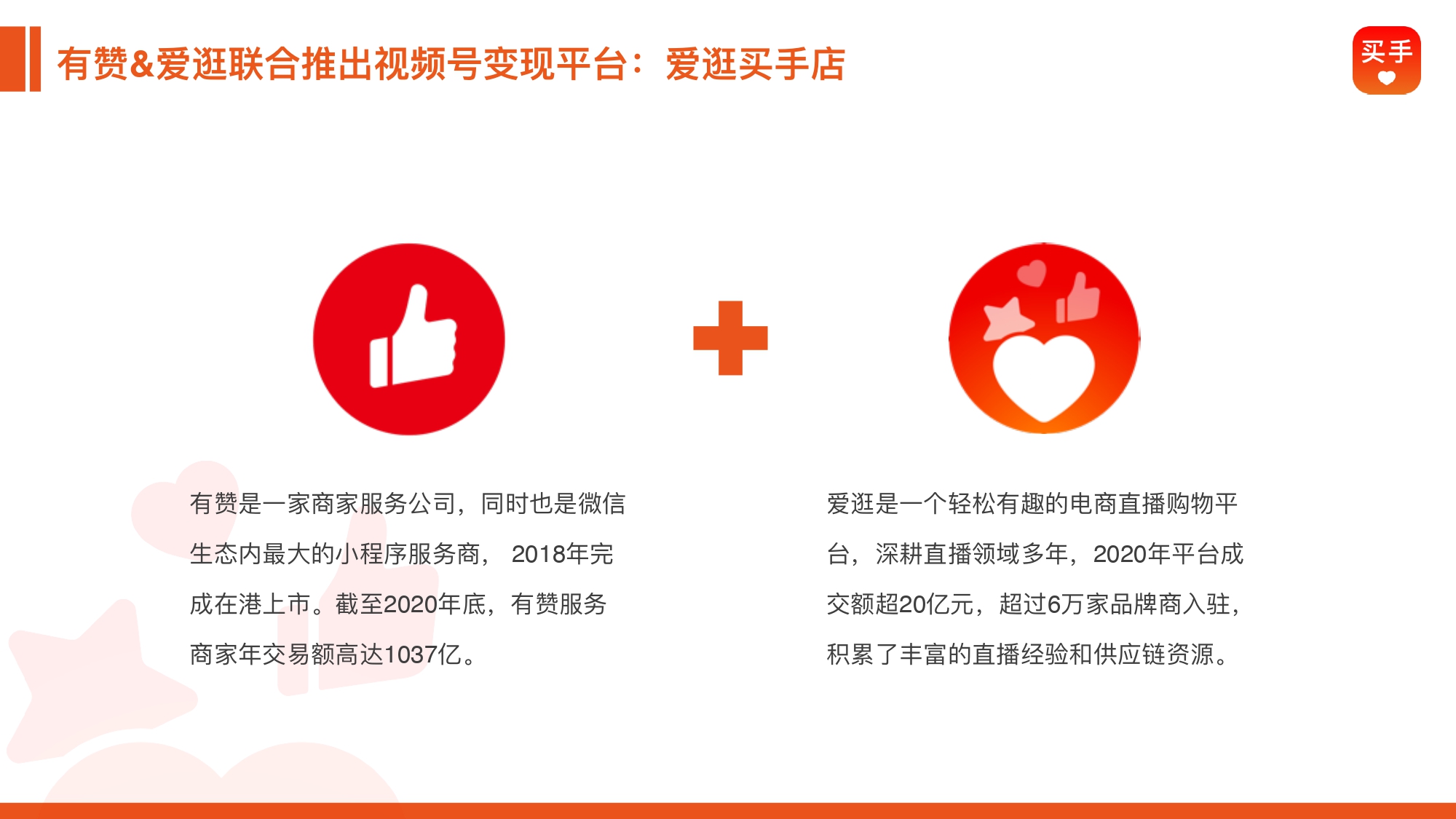 爱逛买⼿店赋能视频号创作者,提供⼀站式⽆忧卖货的服务体验。同时给到商家更高效的带货渠道,双赢。 如何成为爱逛供货商?有赞微商城商家免费⼊驻,爱逛不收取年费、平台费、服务费。 如何进行推广?商品⼀键导⼊,快速提交商品进行推⼴。 如何带货?平台触达海量达⼈,定向精准匹配,⽆须商家⼀⼀对接,省时省⼒。 如何运营?多种⽅式营销策划,专业培训提⾼内容能⼒,联合孵化爆款。同时提供多种对达⼈、消费者的营销活动,帮助商家触达更多达⼈、提⾼订单转化。还提供详细数据分析报表,助⼒商家掌握经营情况,提⾼运营决策⽔平。 想了解更多信息,可查看完整报告获得。