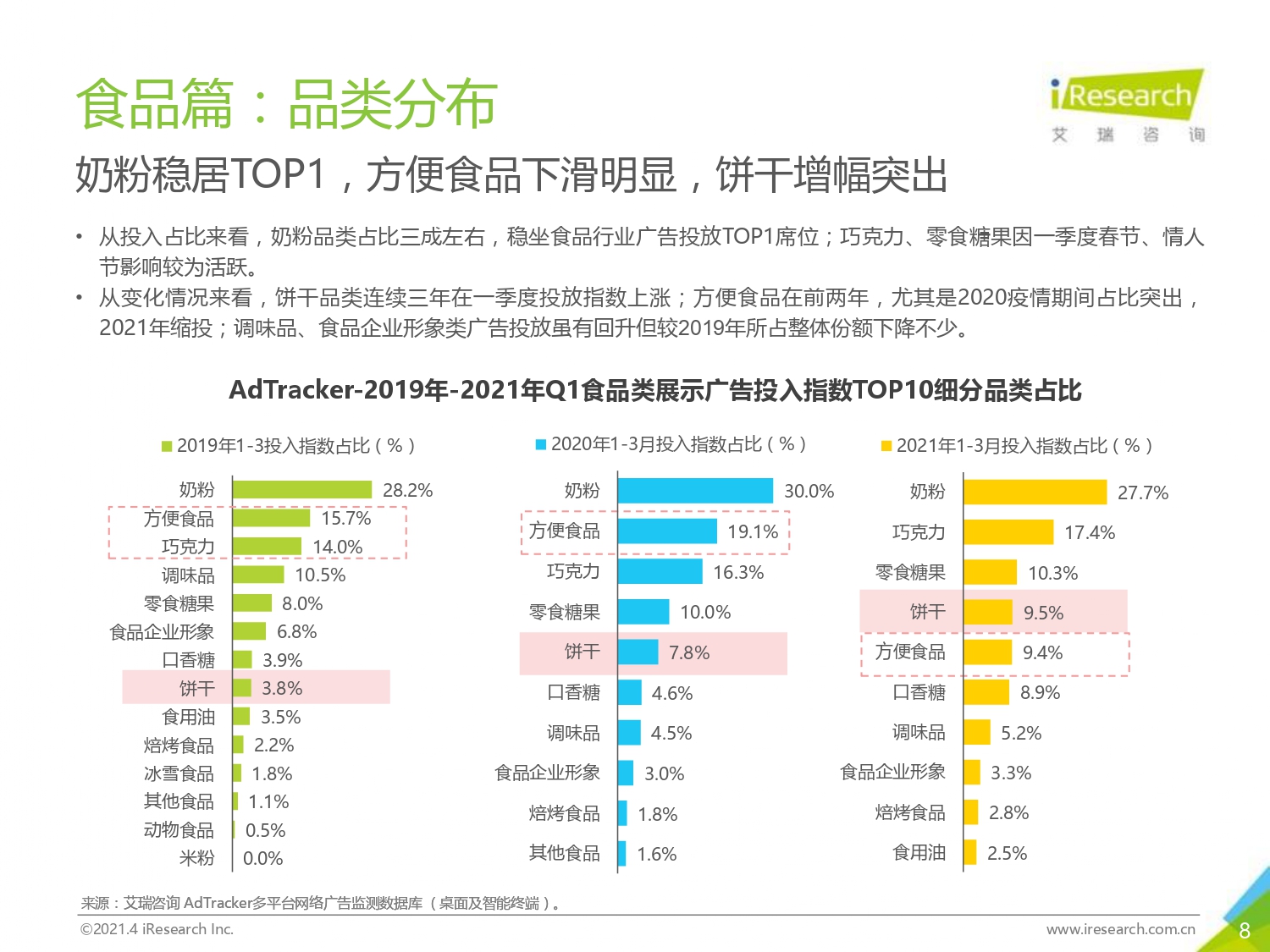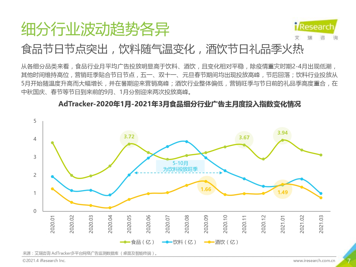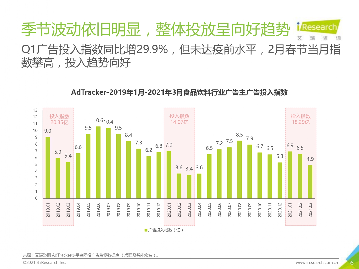 在食品饮料赛道持续获资本关注、线上渠道消费增长之下,食品饮料行业广告投放的心态积极,2021年1-3月总投入指数同比增长29.9%,整体投放趋势向好。 季节波动依旧明显,细分行业波动趋势各异,其中食品节日节点突出、饮料随气温变化、酒饮节日礼品季火热。 数字营销模式主要以展示类广告为代表的非内容营销和以综艺赞助、KOL联动为代表的内容营销为主。 更多细节可查看完整报告获取。