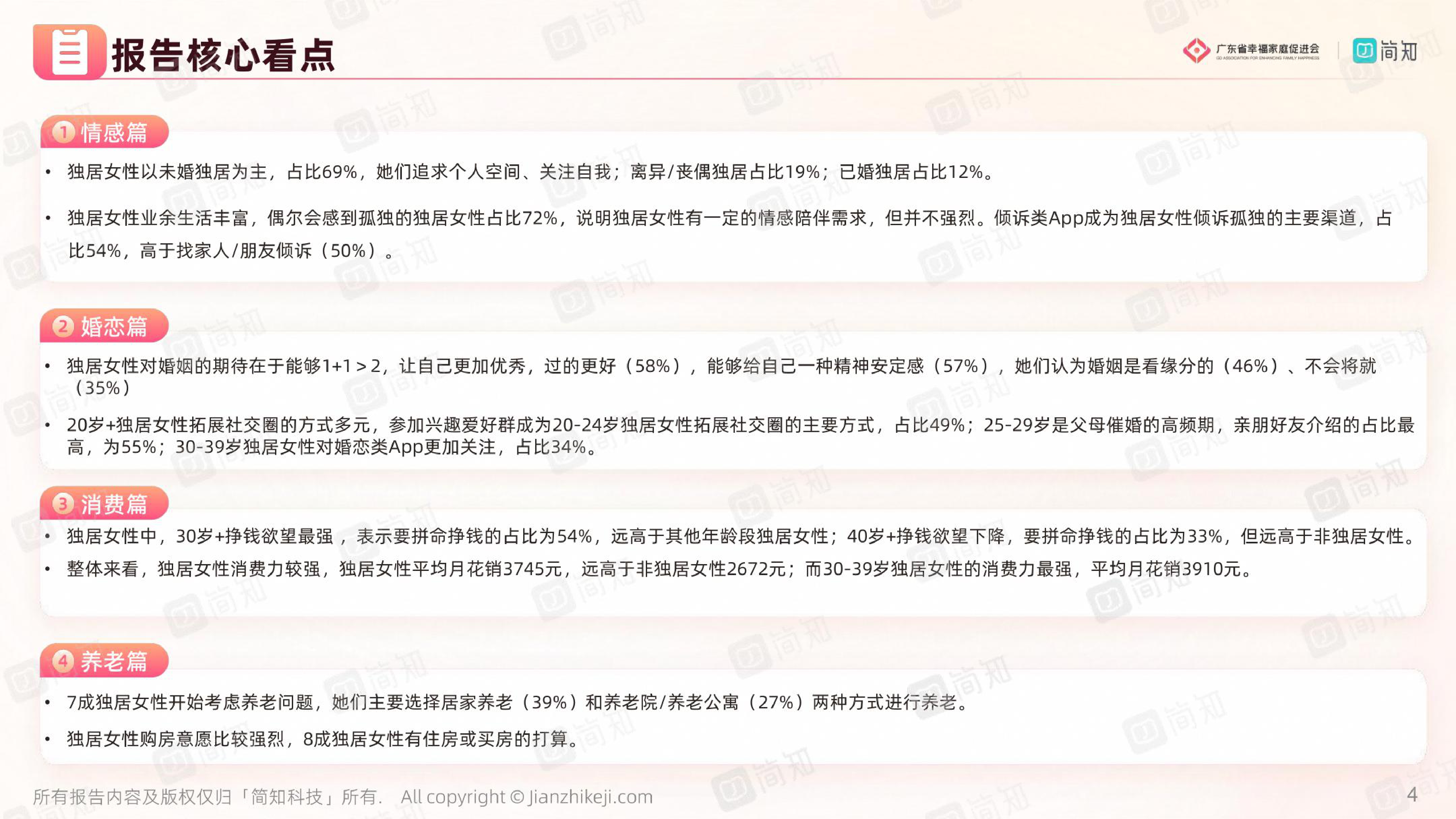 中国独居女性的生活现状是一个备受关注的话题。不同于过往的“剩女〞,当代独居女性往往是主动选择了独自生活,群体数量逐渐增加,从一线大城市蔓延到二线、三线、县级市,对传统的家庭结构和社会关系都造成了一定的冲击。 人们认可独居所代表的生活独立、空间自由、对于个性与自我的包容,同时也对独居女性所面临的人身和经济安全、心理和情感健康以及养老等问题存在普遍的忧虑。 当代独居女性生活现状如何?有着怎么样的需求和特点?查看完整报告获取更多信息~