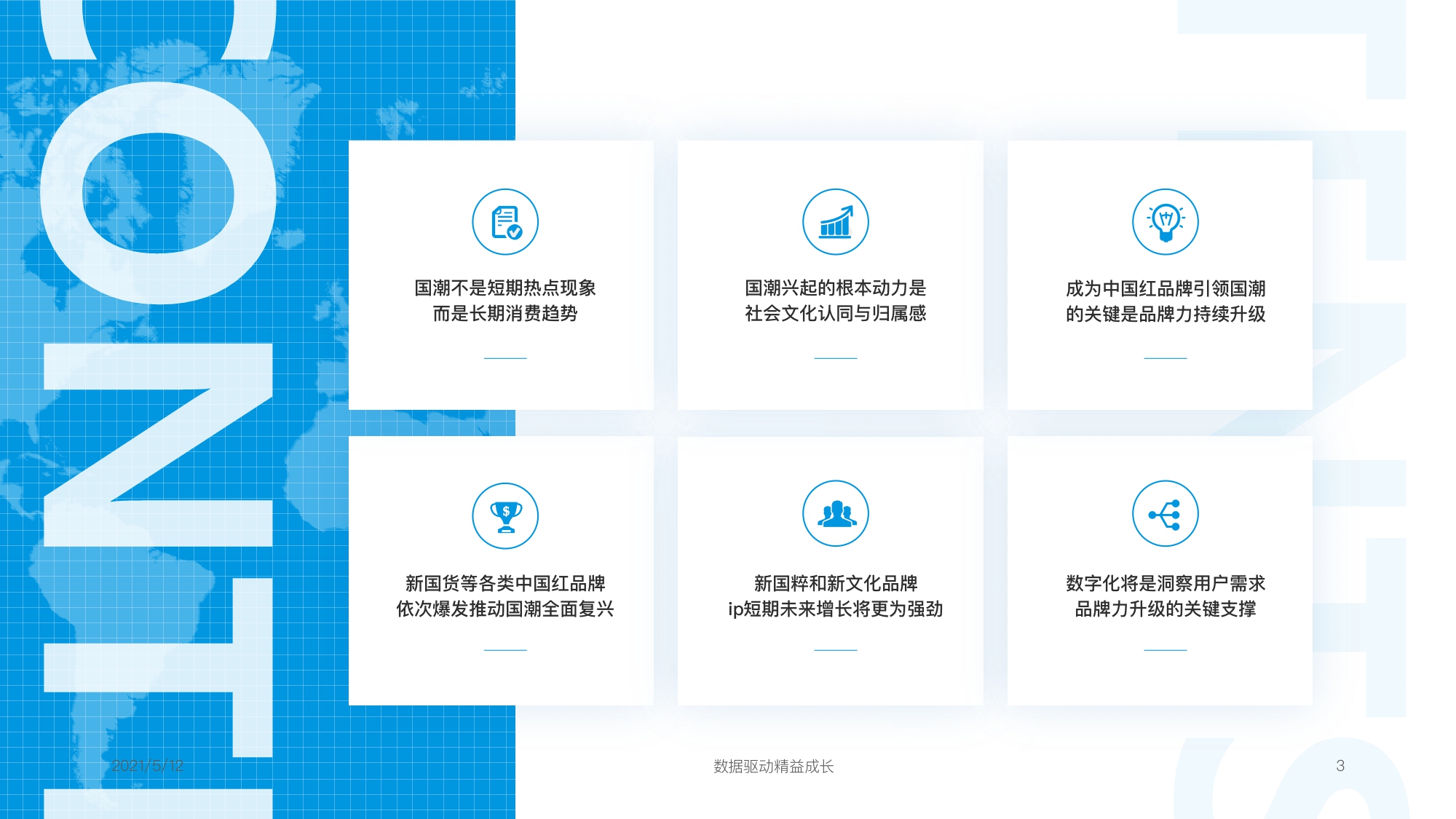 国潮不是短期热点现象⽽是⻓期消费趋势,国潮兴起的根本动⼒是社会⽂化认同与归属感。 成为中国红品牌引领国潮的关键是品牌⼒持续升级,同时新国货等各类中国红品牌依次爆发推动了国潮全⾯复兴。 新国粹和新⽂化品牌ip短期未来增⻓将更为强劲,数字化将是洞察⽤户需求品牌⼒升级的关键⽀撑。 品牌该如何抓住这样的机遇?