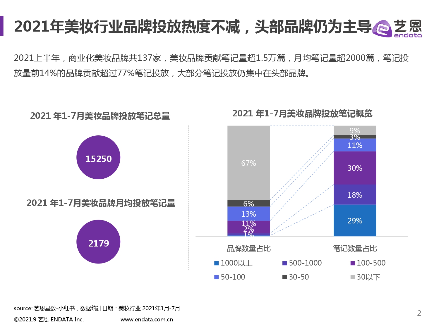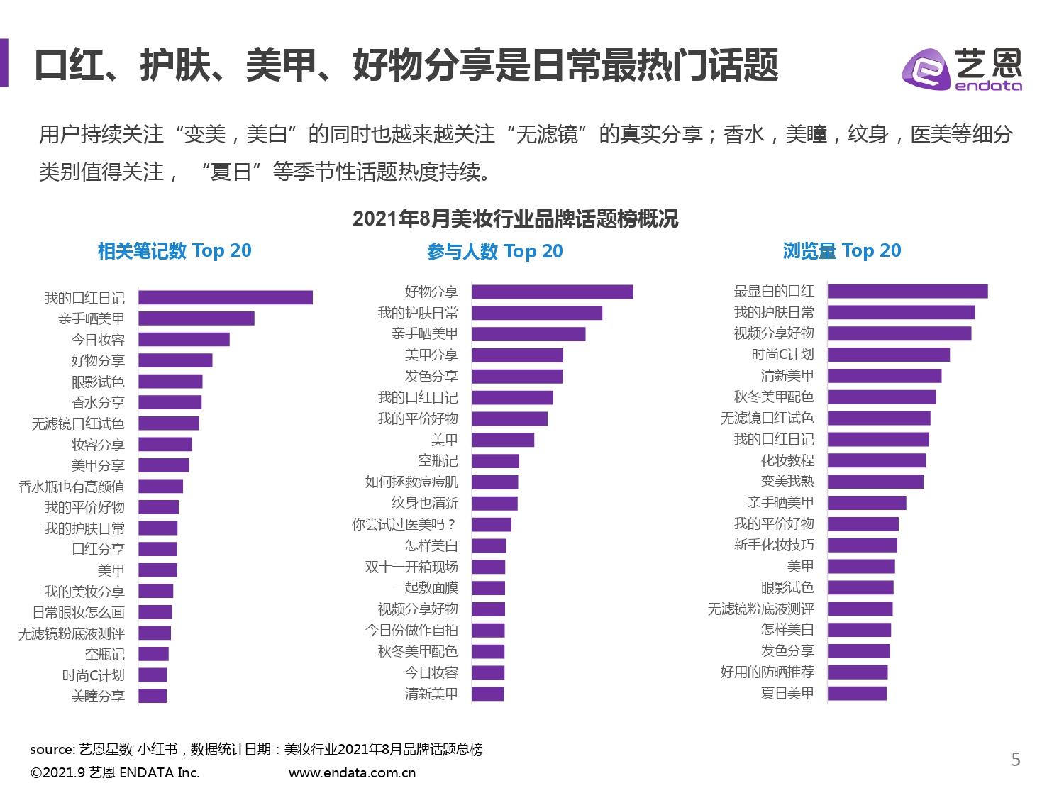 2021年美妆行业品牌投放热度不减,头部品牌仍为主导。 在达人方面,美妆行业新晋达人影响力不断提升,形成新格局。新晋达人男性博主初现潜力,直播助力增强粘性。 内容分享方面,口红、护肤、美甲、好物分享是日常最热门话题。即将过去的夏日,显白主题贴合季节性场景潜力较大,结合时下热点很关键。 品牌如何切入小红书投放赛道? 1.利用产品试色特征通过 KOL/KOC 试色分享合作,积极主导笔记运营; 2.产品塑造和概念强调高颜值的同时不忘专业科研背书; 3.充分利用平台工具,开设直播 Ta 的瞬间、直播打卡、活动打卡、新品发布等活动增强用户粘性;与头部大牌相比,新锐品牌更加灵活,主页直通店铺落地、承接、集合产品到商品详情形成种草收割的全链路闭环。