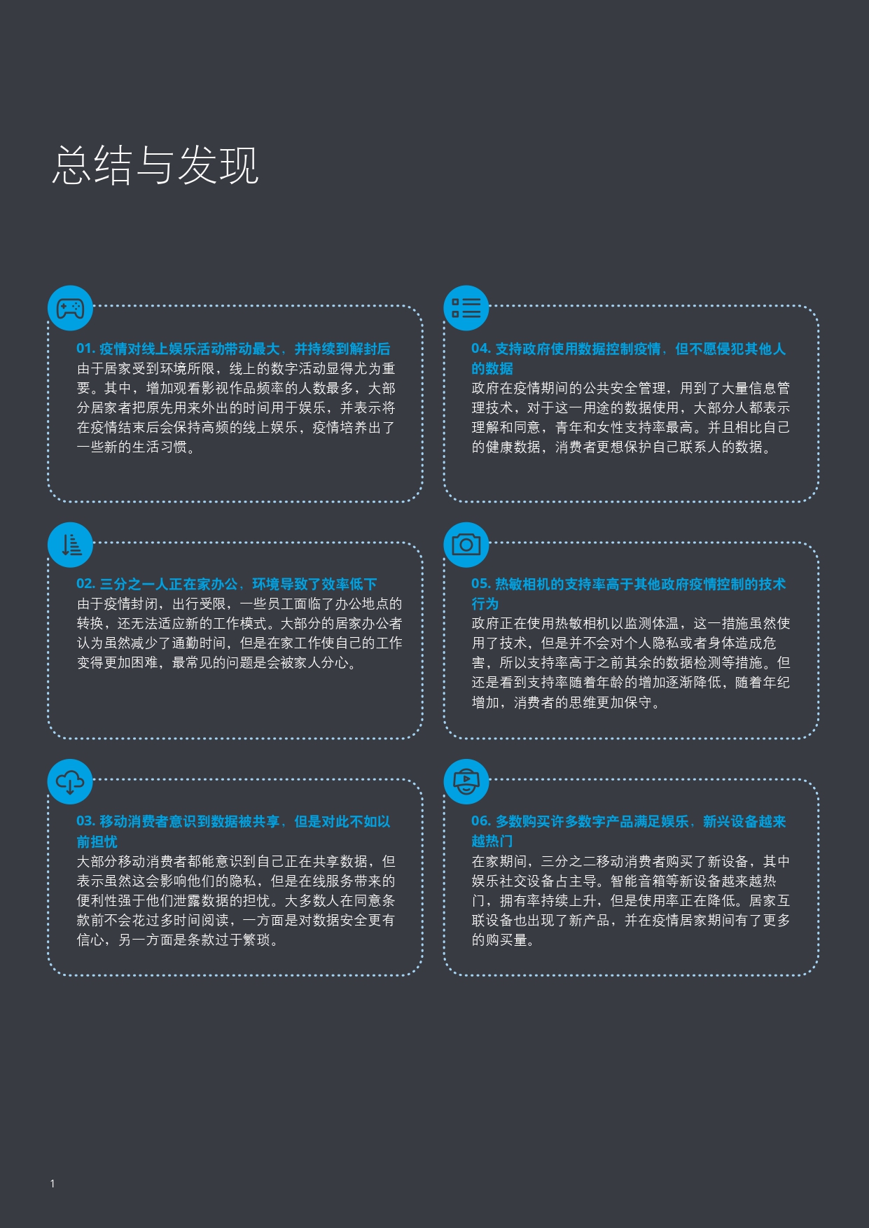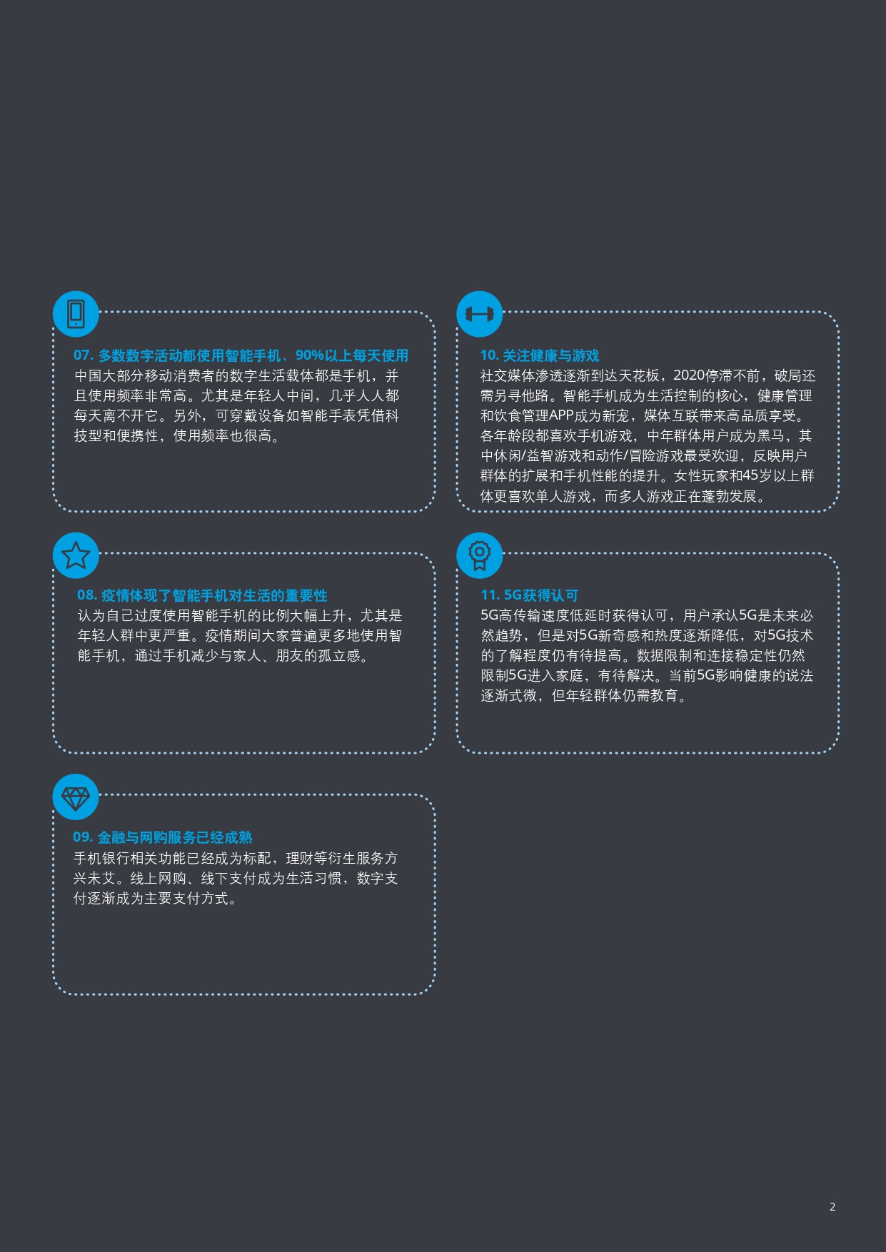 疫情影响下,中国移动消费者的日常行为习惯有哪些变化和趋势?通过这些变化我们可以获得一些生意经营的灵感和方向。 1. 疫情对线上娱乐活动带动最大,并持续到解封后; 2. 疫情期间三分之一人正在家办公,环境导致了效率低下; 3.移动消费者意识到数据被共享,但是对此不如以前担忧; 4.支持政府使用数据控制疫情,但不愿侵犯其他人的数据; 5.热敏相机的支持率高于其他政府疫情控制的技术行为; 6.多数购买许多数字产品满足娱乐,新兴设备越来越热门; 7.多数数字活动都使用智能手机,90%以上每天使用; 8.疫情体现了智能手机对生活的重要性; 9.金融与网购服务已经成熟; 10.关注健康与游戏; 11.疫情影响下,中国移动消费者的日常行为习惯有哪些变化和趋势?通过这些变化我们可以获得一些生意经营的灵感和方向。 1. 疫情对线上娱乐活动带动最大,并持续到解封后; 2. 疫情期间三