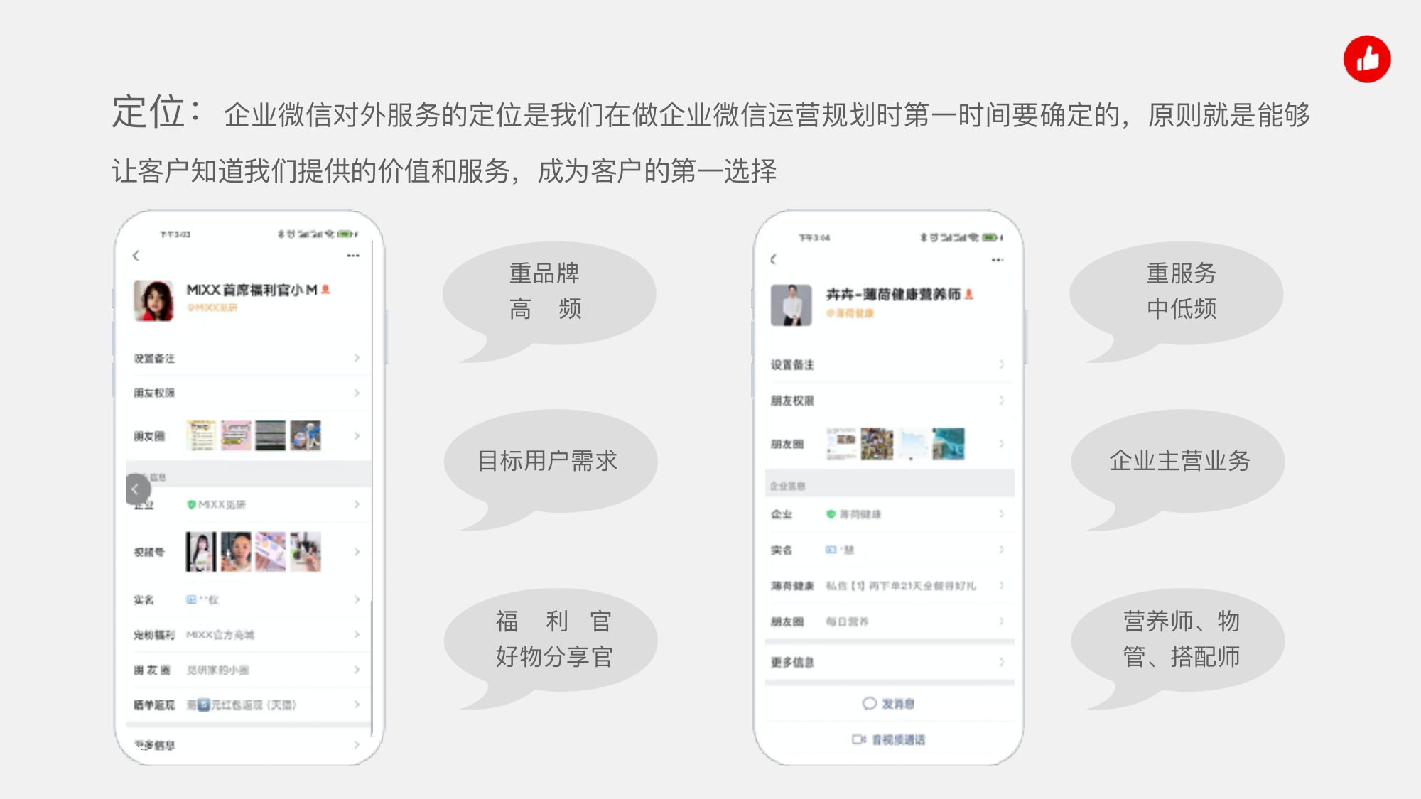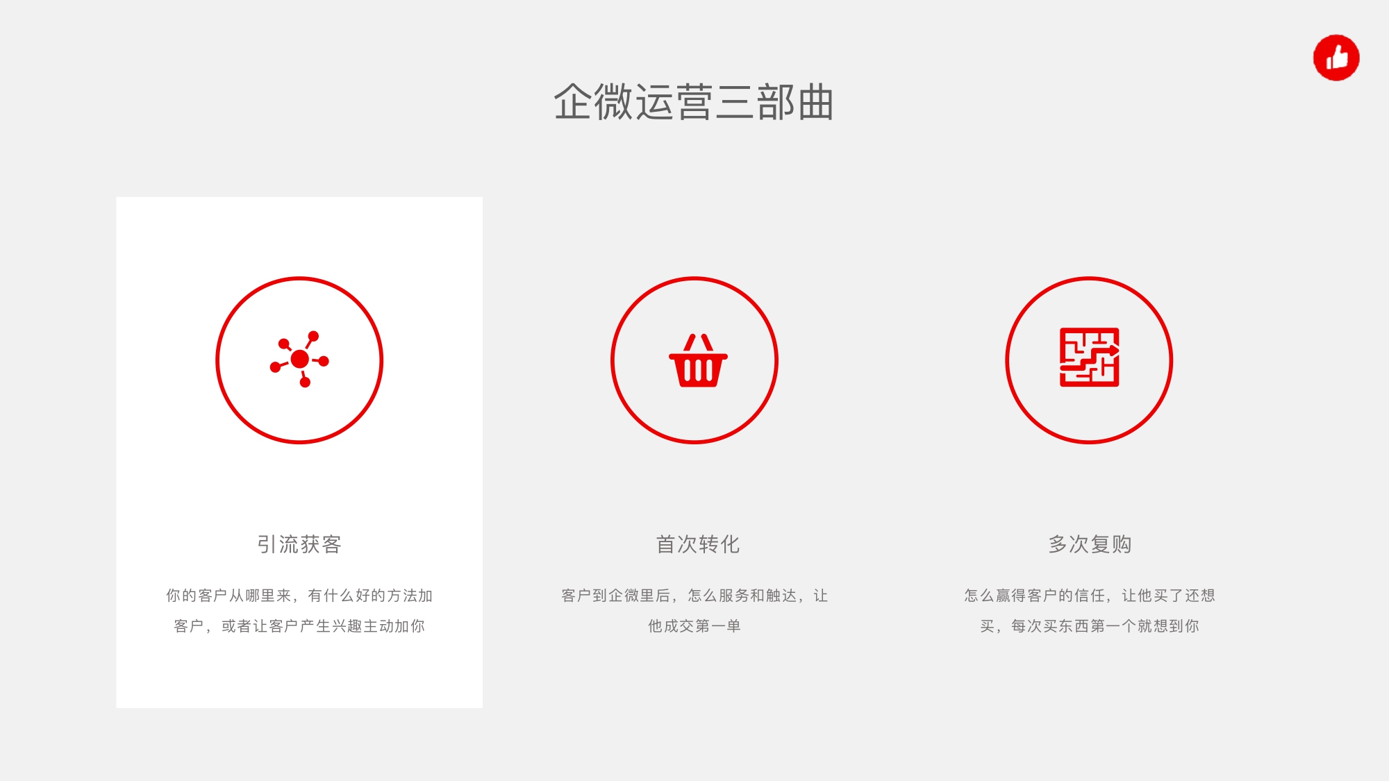 有赞企业微信助手,私域生意增长大杀器。 分享企业微信运营的三部曲: 1.引流获客:你的客户从哪⾥来,有什么好的⽅法加客户,或者让客户产⽣兴趣主动加你; 2.首次转化:客户到企微⾥后,怎么服务和触达,让他成交第⼀单; 3.多次复购:怎么赢得客户的信任,让他买了还想买,每次买东⻄第⼀个就想到你; 总结一个顺口溜,可以供大家参考: 账号 IP 定位好,利益钩⼦少不了,⼯具帮你打标签,线上线下两⼿抓,客户个个不想跑。
