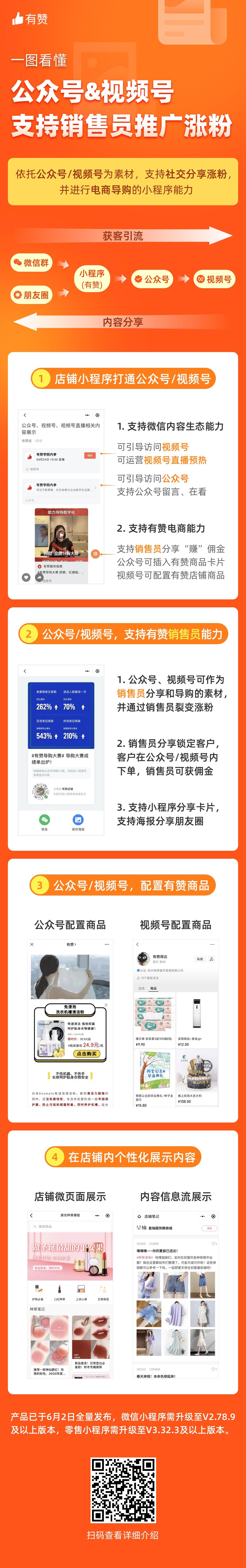 依托公众号、视频号为素材,支持社交分享涨粉,并进行电商导购的小程序能力。 1.店铺小程序打通公众号、视频号 (1)支持微信内容生态能力,可以引导访问视频号,可运营视频号直播预热;可引导访问公众号,支持公众号留言、在看; (2)支持有赞电商能力,支持销售员分享“赚”佣金,公众号可插入有赞商品卡片,视频号可配置有赞店铺商品。 2.公众号、视频号,支持有赞销售员能力 (1)公众号、视频号可作为销售员分享和导购的素材,并通过销售员裂变涨粉; (2)销售员分享锁定客户,客户在公众号、视频号内下单,销售员可获佣金; (3)支持小程序分享卡片,支持海报分享朋友圈 3.公众号、视频号支持配置有赞商品