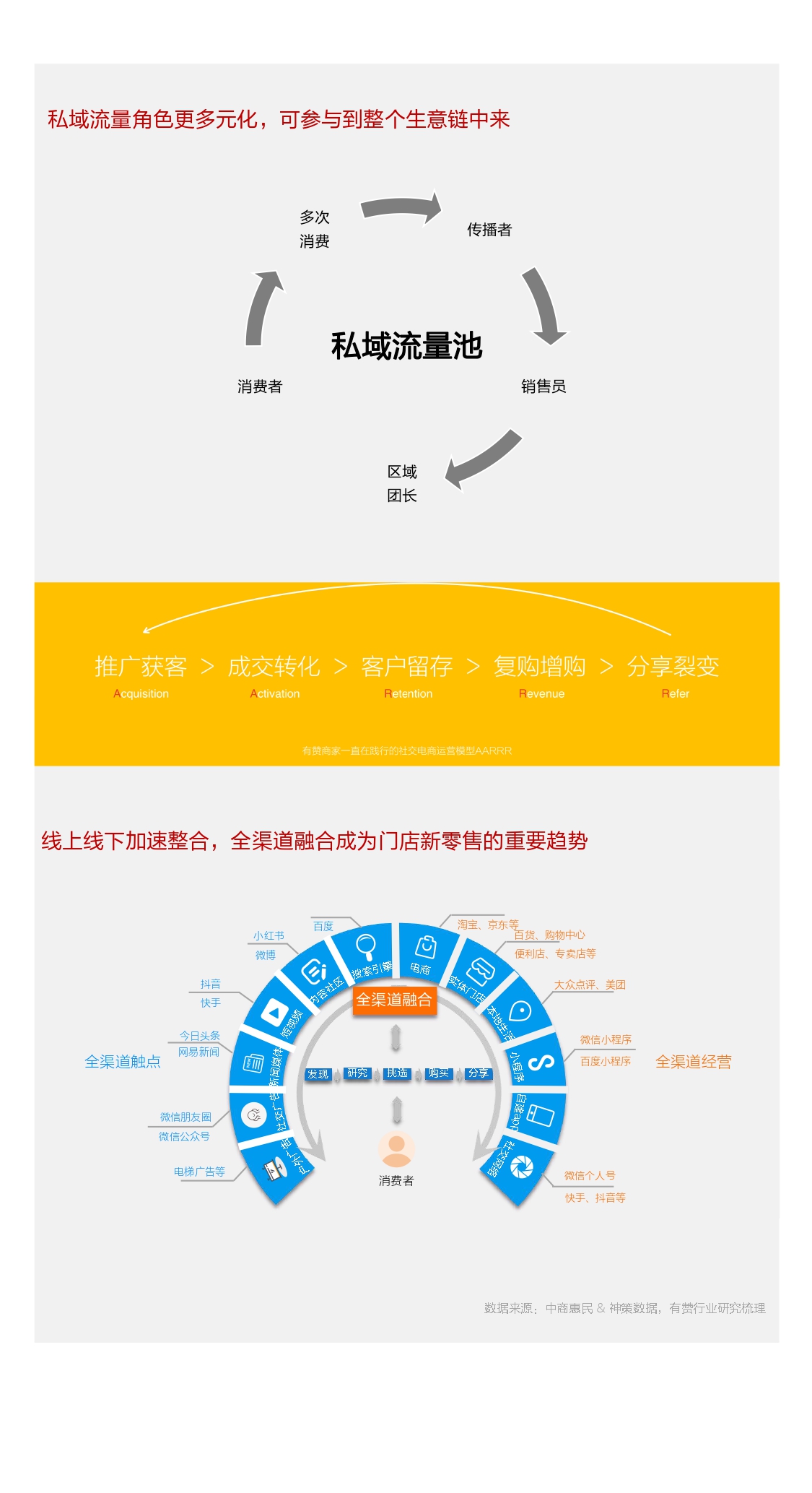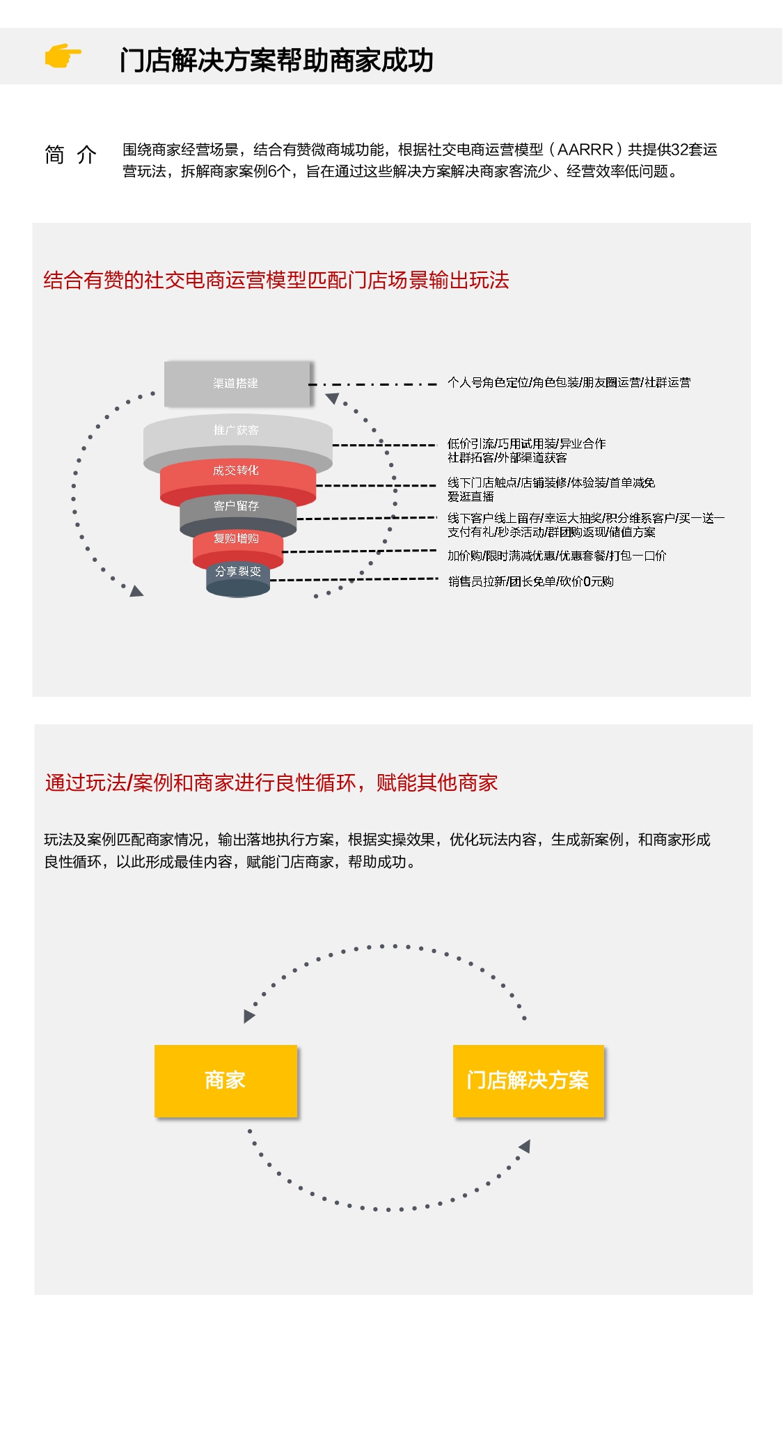 目前门店商家普遍存在进店客户少、促销效果差、成本越来越高等问题,其实搭建自己的专属私域流量,以及全渠道销售是有效的破局方式。 有赞提供32种玩法,渠道/获客/转化/留存/复购/增购/裂变全面提升门店销量。 报告内有提到6篇案例,我们可以看看大咖如何用有赞实现全渠道运营?从而得到进行门店私域流量运营的思考和灵感。