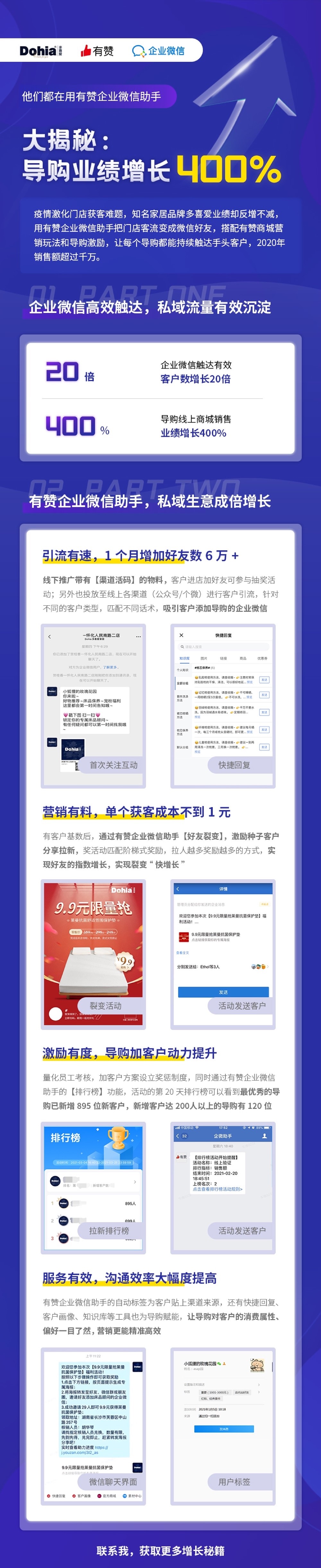 疫情激化门店获客难题,知名家居品牌多喜爱业绩却反增不减。用有赞企业微信助手把门店客流变成微信好友,进行私域流量的有效沉淀,搭配有赞商城销玩法和导购激励,让每个导购都能持续触达手头客户,2020年销售额超过千万,私域生意城北增长。 引流有速、营销有料、激励有度、服务有效,看看有什么值得借鉴的?