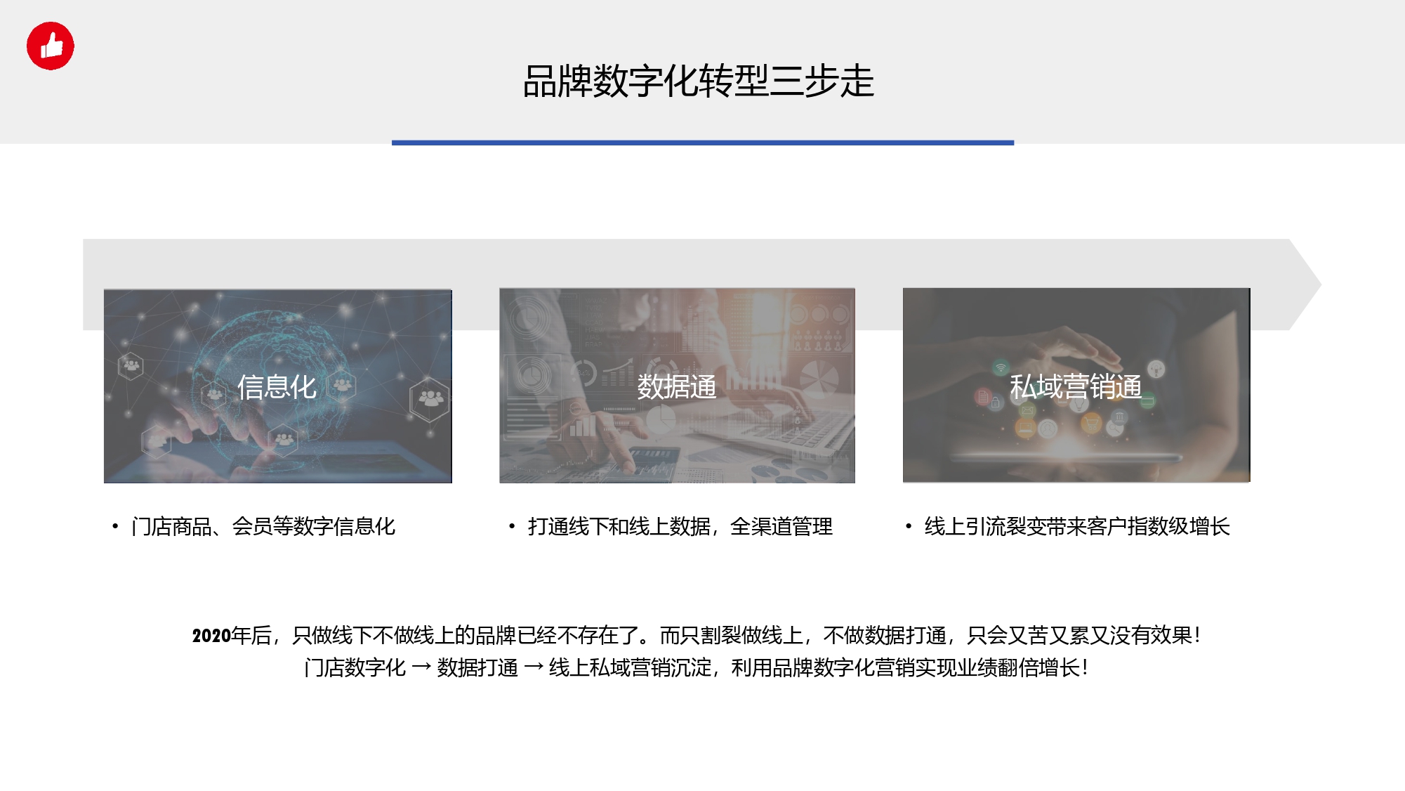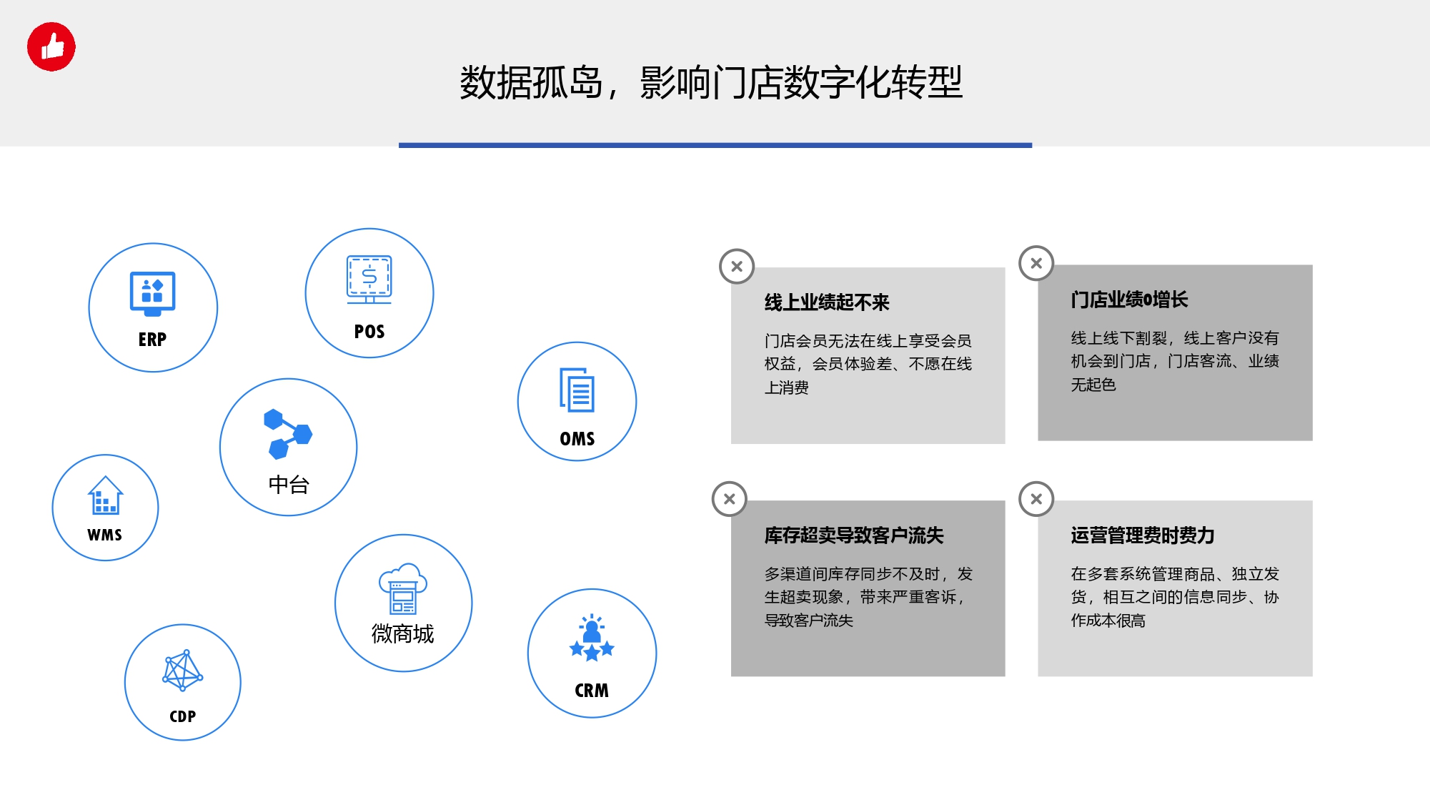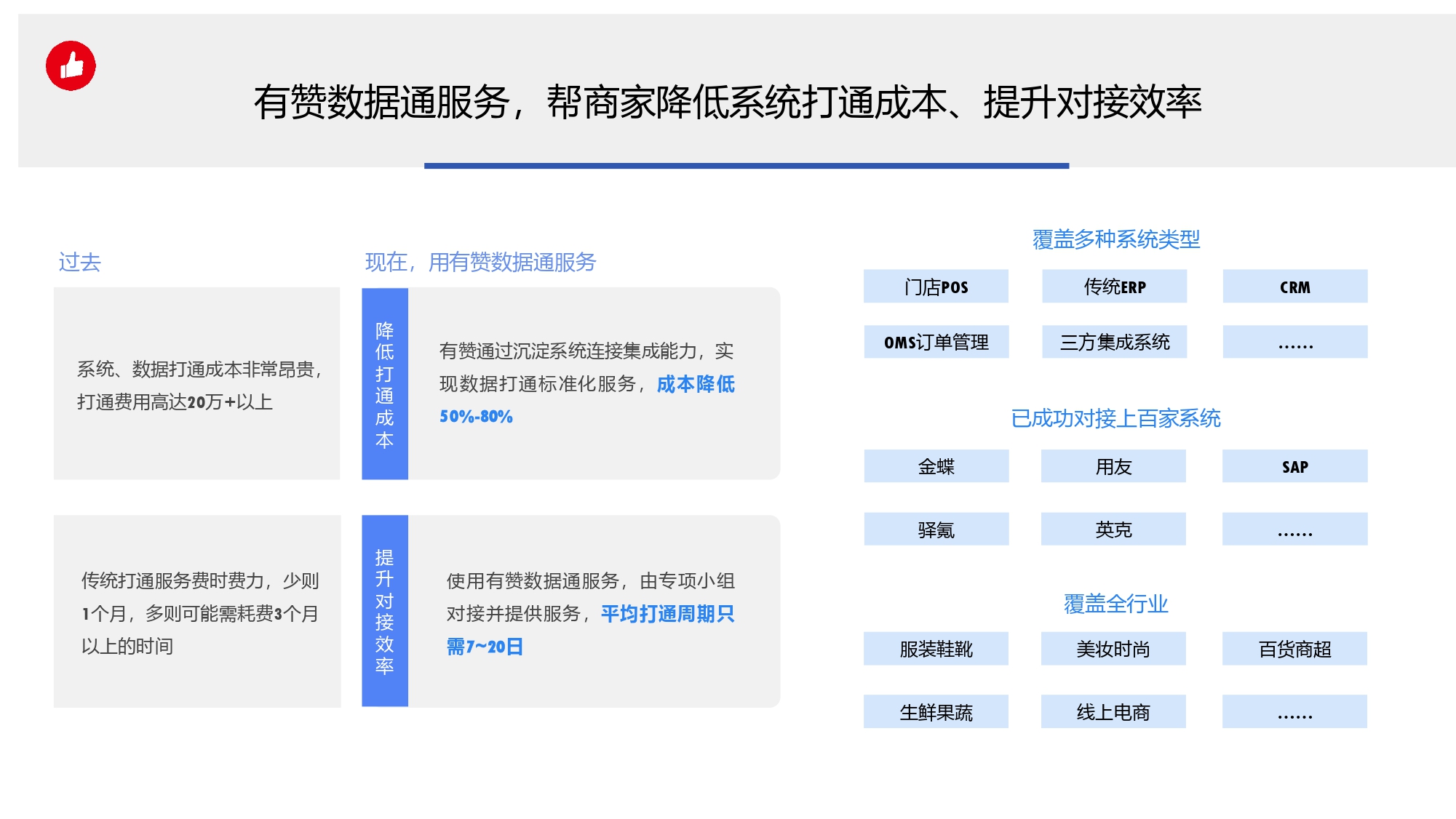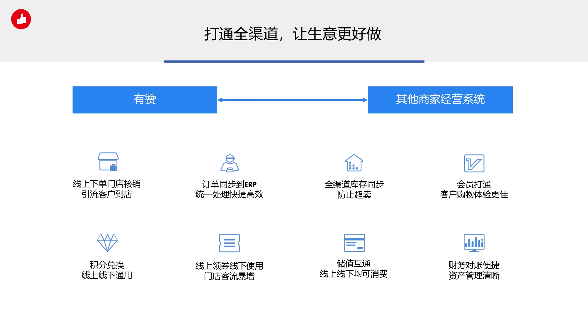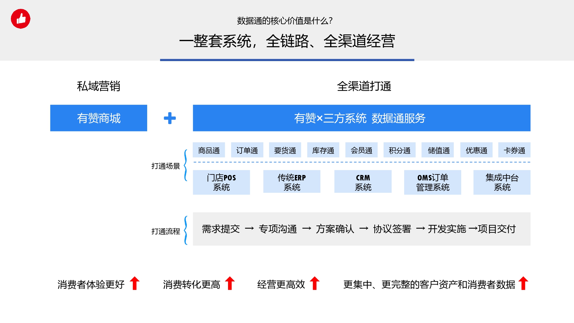疫情过后,只做线下不做线上的品牌已经不存在了。而只割裂做线上,不做数据打通,只会又苦又累又没有效果! 整个品牌门店数字化转型分为三部分: 1.信息化:门店商品、会员等数字信息化; 2.数据痛:打通线下和线上数据,全渠道管理; 3.私域营销通:线上引流、裂变带来客户指数级增长; 利用品牌数字化营销,实现企业业绩翻倍增长! 数据孤岛,一定会影响门店数字化转型,有赞数据通服务,帮商家降低系统打通成本、提升对接效率。