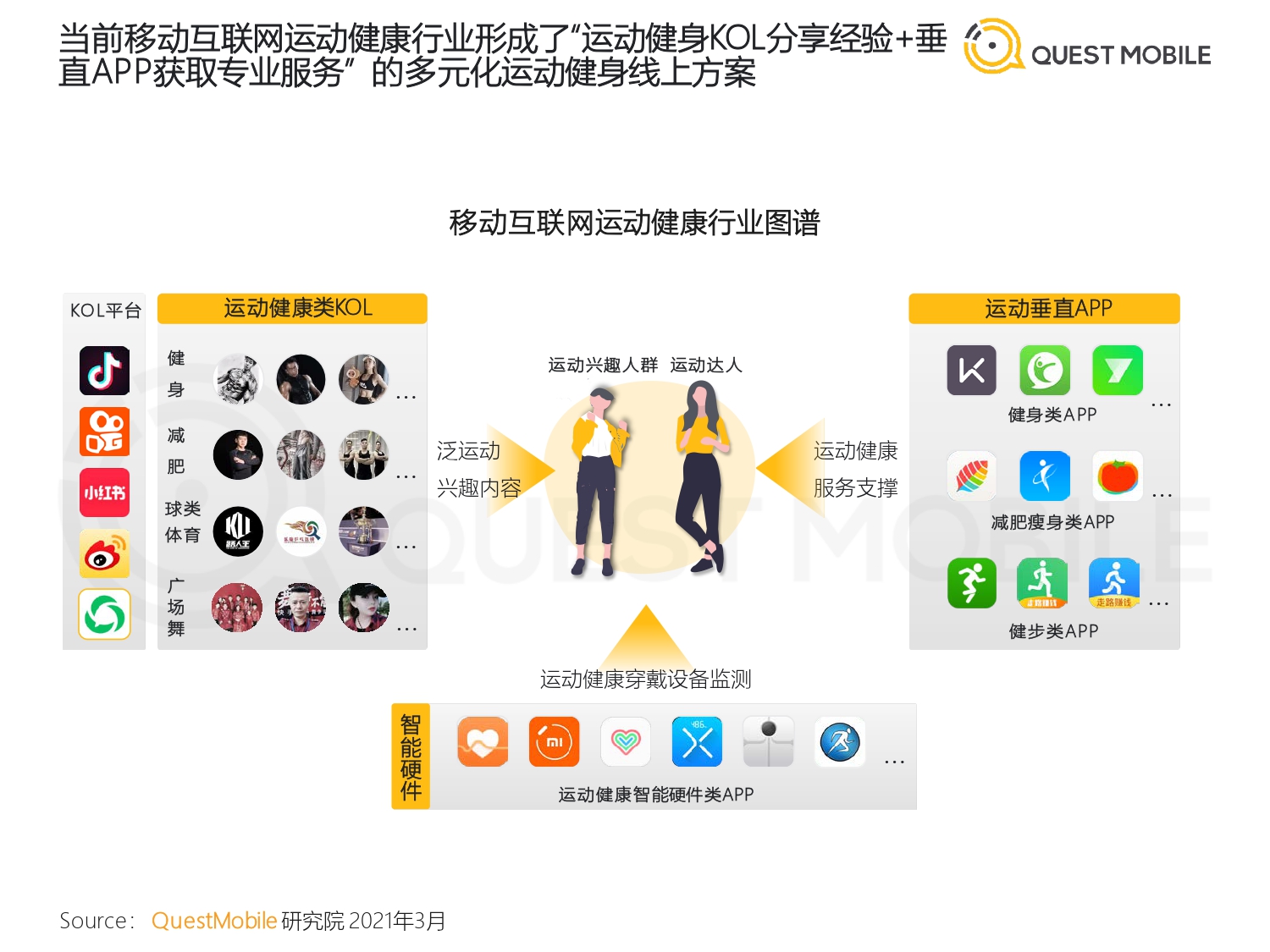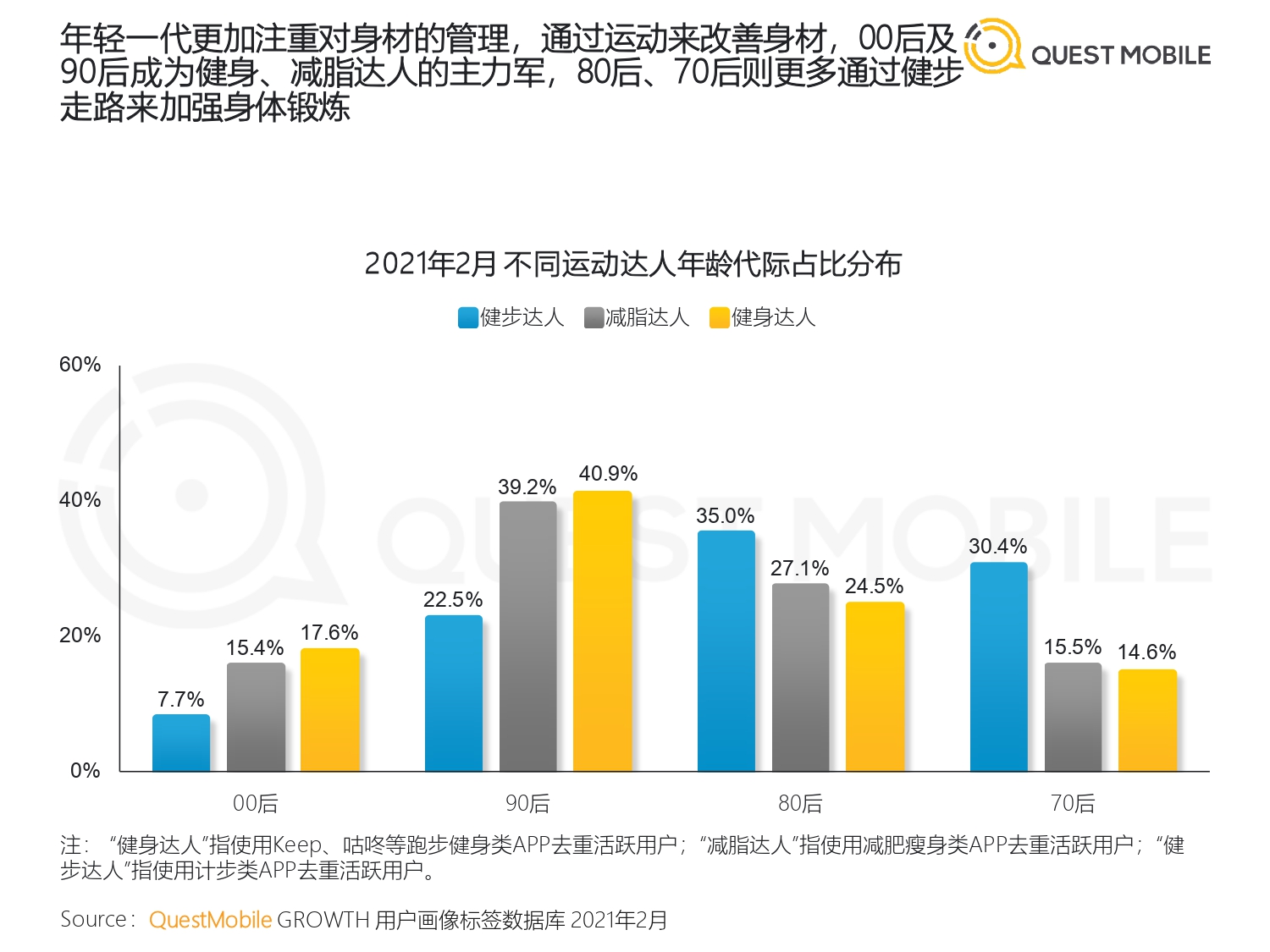 移动互联网推动运动健康数字化升级,大众运动更加科学及智能化。 当前移动互联网运动健康行业形成了“运动健身KOL分享经验+垂直APP获取专业服务”的多元化运动健身线上方案。 伴随人们对自身健康关注的愈加重视,丰富多彩的运动健身内容吸引7.8亿用户线上“云运动”,使用垂直专业健身APP的运动达人规模也近6000万,其中女性占比51.7%。 年轻一代更加注重对身材的管理,通过运动来改善身材,00后及90后成为健身、减脂达人的主力军,80后、70后则更多通过健步走路来加强身体锻炼。 相关商家该如何抓住这样的机遇?