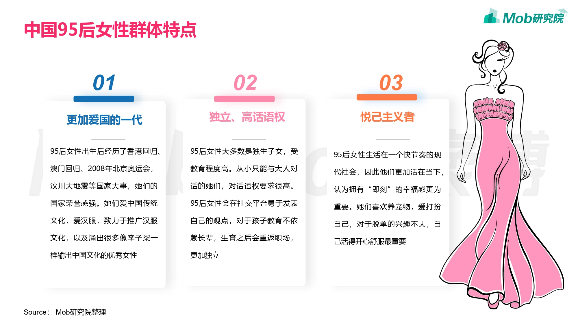 95后女性出生后经历了香港回归、澳门回归、2008年北京奥运会,汶川大地震等国家大事,她们的国家荣誉感强。她们爱中国传统文化,爱汉服,致力于推广汉服文化。 95后女性大多数是独生子女,受教育程度高。从小只能与大人对话的她们,对话语权要求很高。95后女性会在社交平台勇于发表自己的观点,对于孩子教育不依赖长辈,生育之后会重返职场,更加独立。 95后女性生活在一个快节奏的现代社会,因此他们更加活在当下,认为拥有“即刻”的幸福感更为重要。她们喜欢养宠物,爱打扮自己,对于脱单的兴趣不大自己活得开心舒服最重要。 95更关注宠物、美妆、医美等行业,商家们又该如何抓住这波机遇?