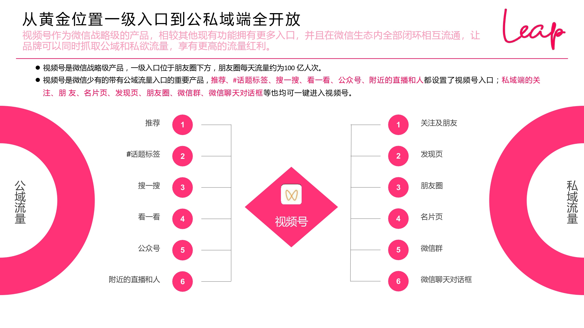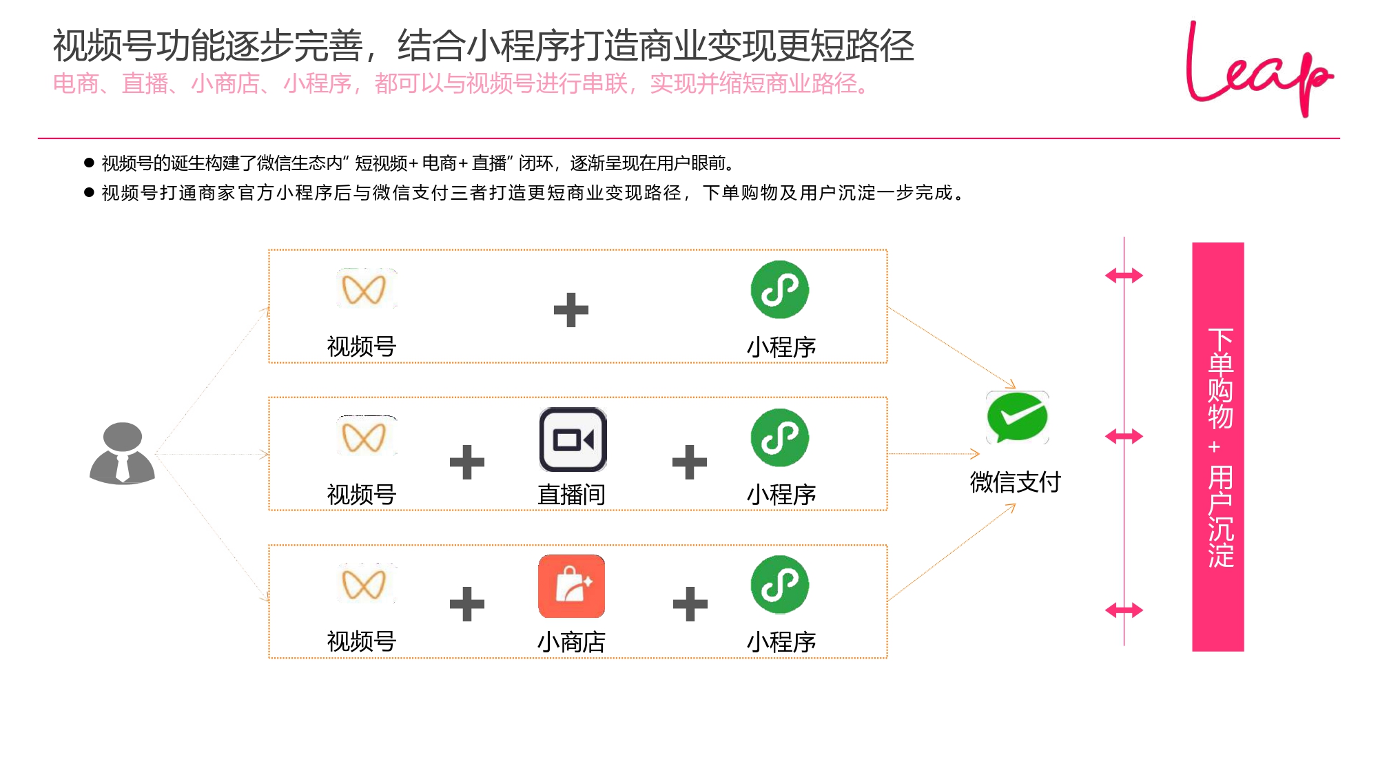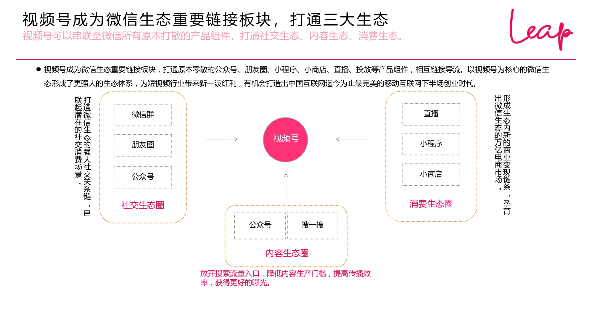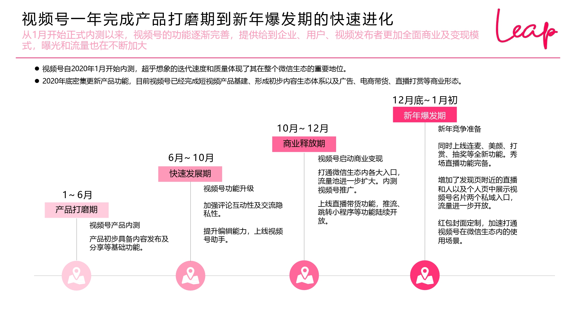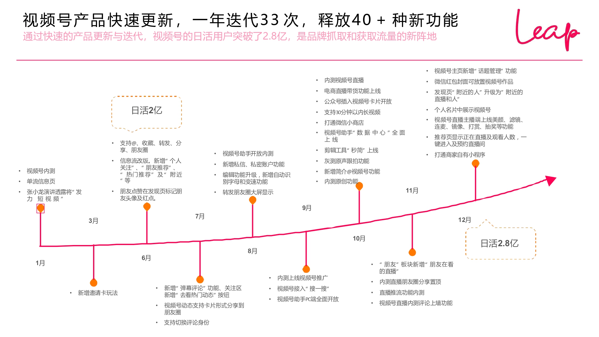视频号一年完成产品打磨期到新年爆发期的快速进化,且产品快速更新,一年迭代33 次,释放40 + 种新功能,结合小程序打造商业变现更短路径。 未来,视频号是知识付费最理想的变现渠道之一。 分享一下未来视频号的几大趋势: 1.激发个人用户独立创作,2021 年视频号数量将超1亿; 2.2021 年视频号日活跃用户将达到5亿; 3.2021 年视频号将发力社交链,用户单日使用超35 分钟; 4.视频号商业化逐步成熟,2021 年GMV有望突破3500 亿; 5.2021 年视频号将成为中国品牌和企业对外的新“ 官网”; 6.2021视频号将成微信生态重要基建,链接全场景构建无界交易;