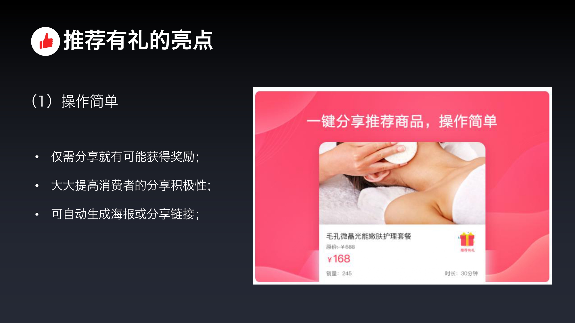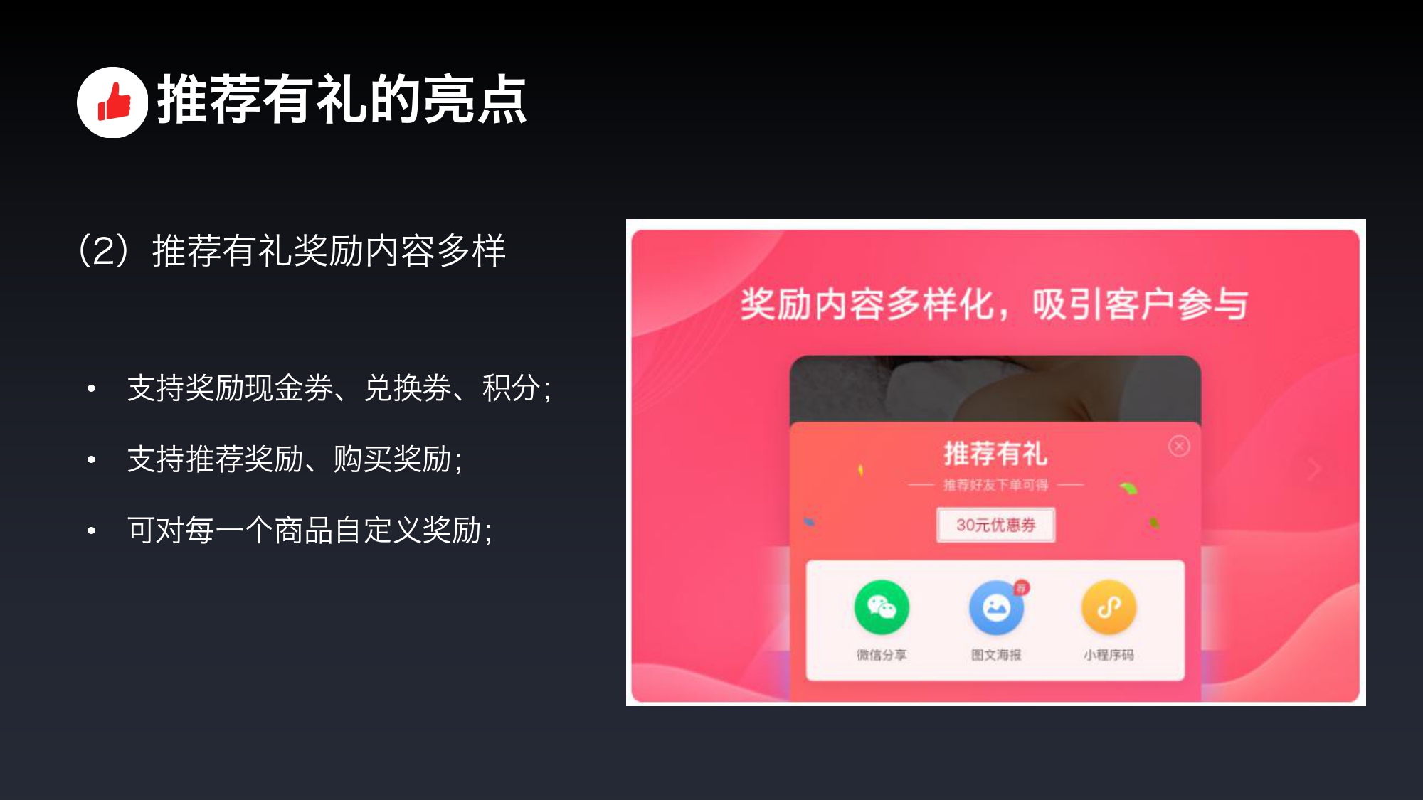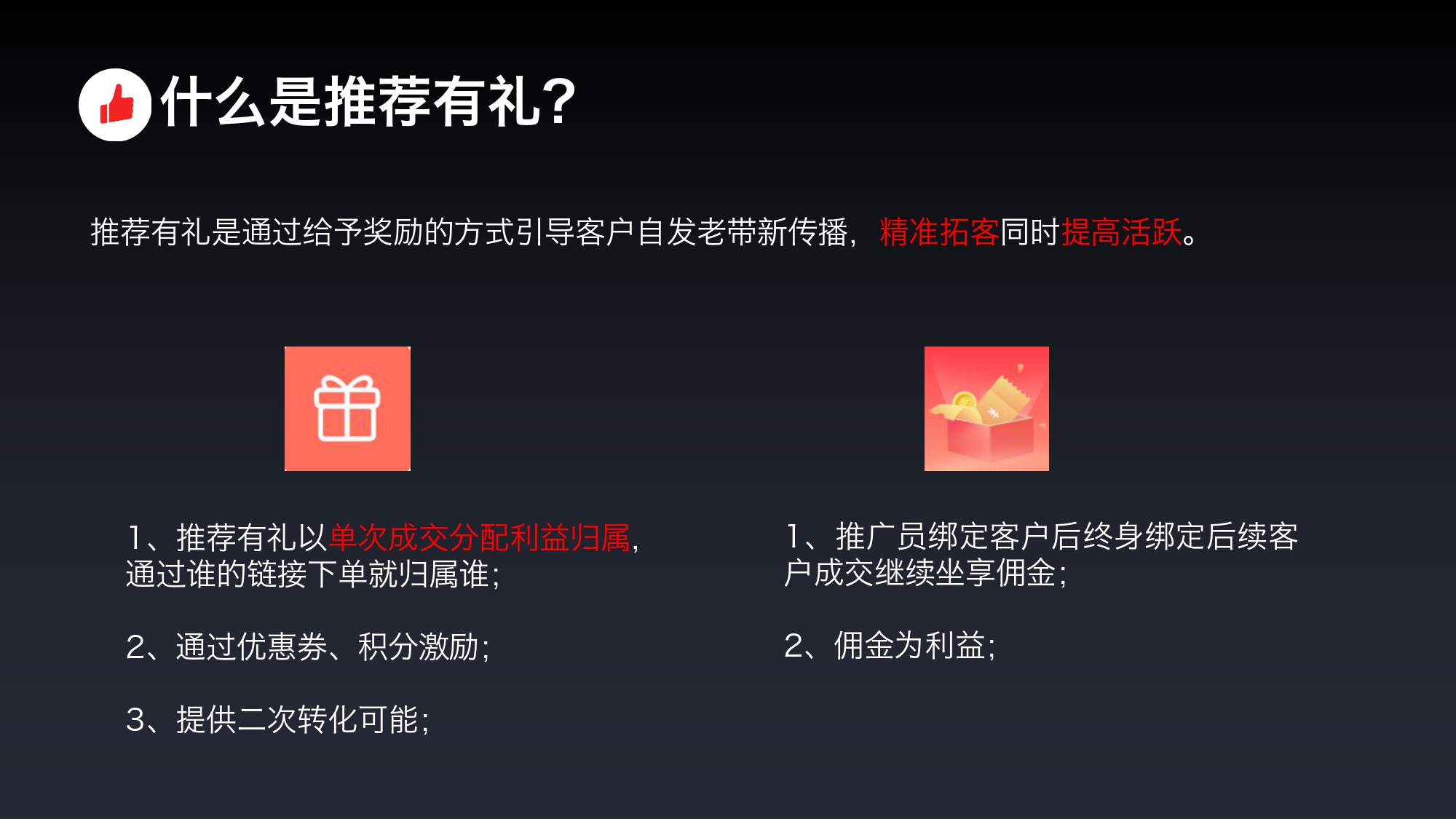 推荐有礼,是通给予奖励的方式引导客户自发老带新传播,精准拓客的同时提高活跃。 推荐有礼的活动操作简单、4步搞定,内容多样且运营门槛低。 那么如何创建一场高效的推荐有礼活动呢? 首先创建活动,其次进行活动推广,再进行奖励记录,最后对于推荐人进行补录,更多细节可以查看完整方案。