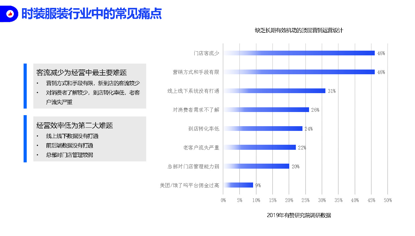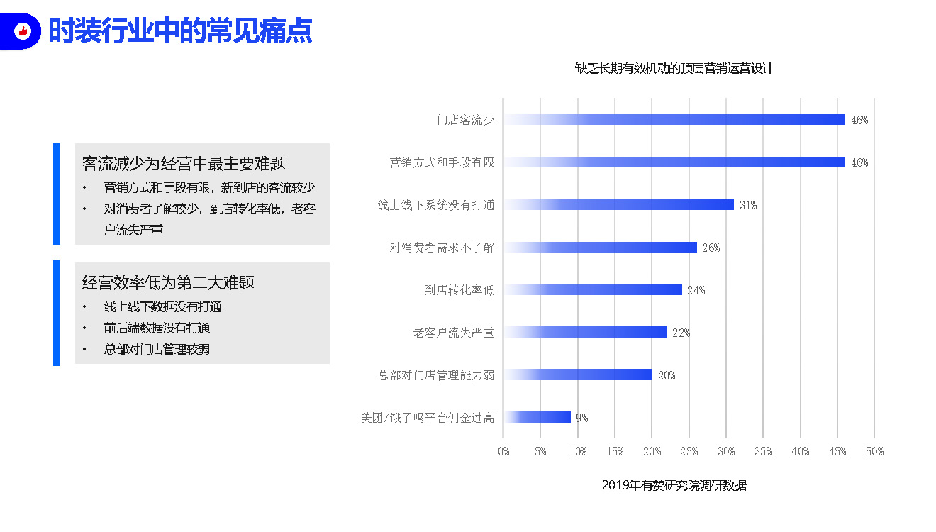 时装服装行业的常见痛点:客流减少为经营中最主要的难题,经营效率低是第二大难题。底层是因为缺乏长期有效机动的顶层营销运营设计。门店客流少、营销方式和手段有限、线上线下系统没有打通、对消费者需求不了解、到店转化率低等等问题也在困扰着时装服装类的商家,这些问题其实是零售商家普遍会遇到的问题。 如何解决?有赞新零售提供了解决方案,也是众多知名品牌探索新零售业务的首选。