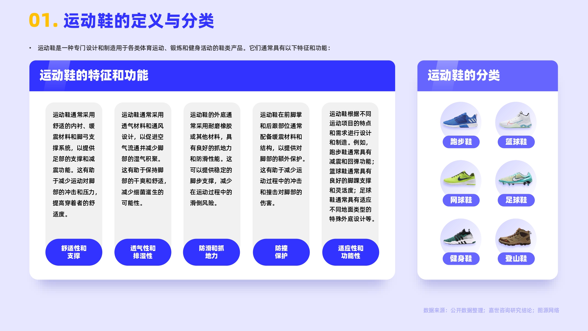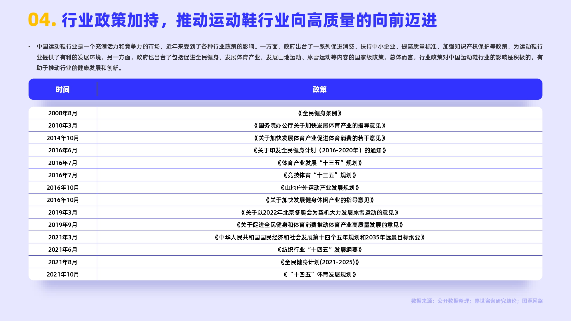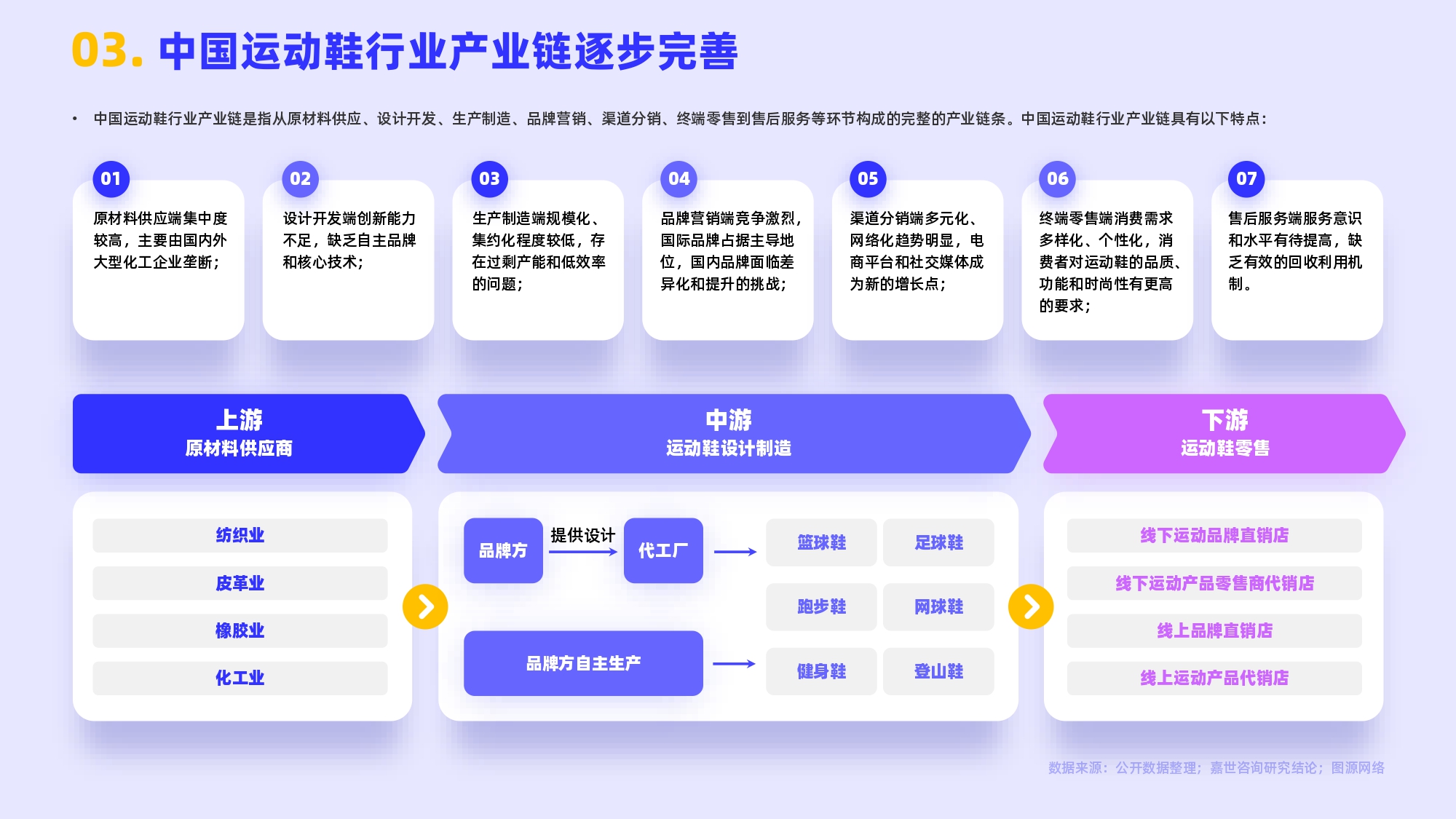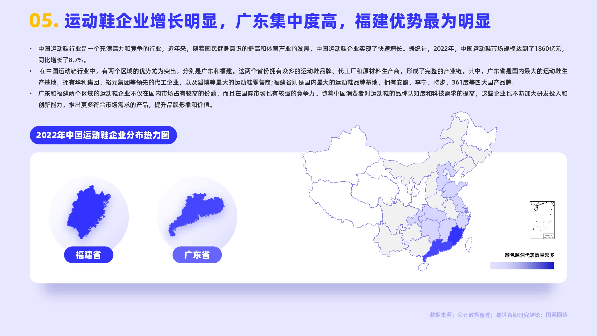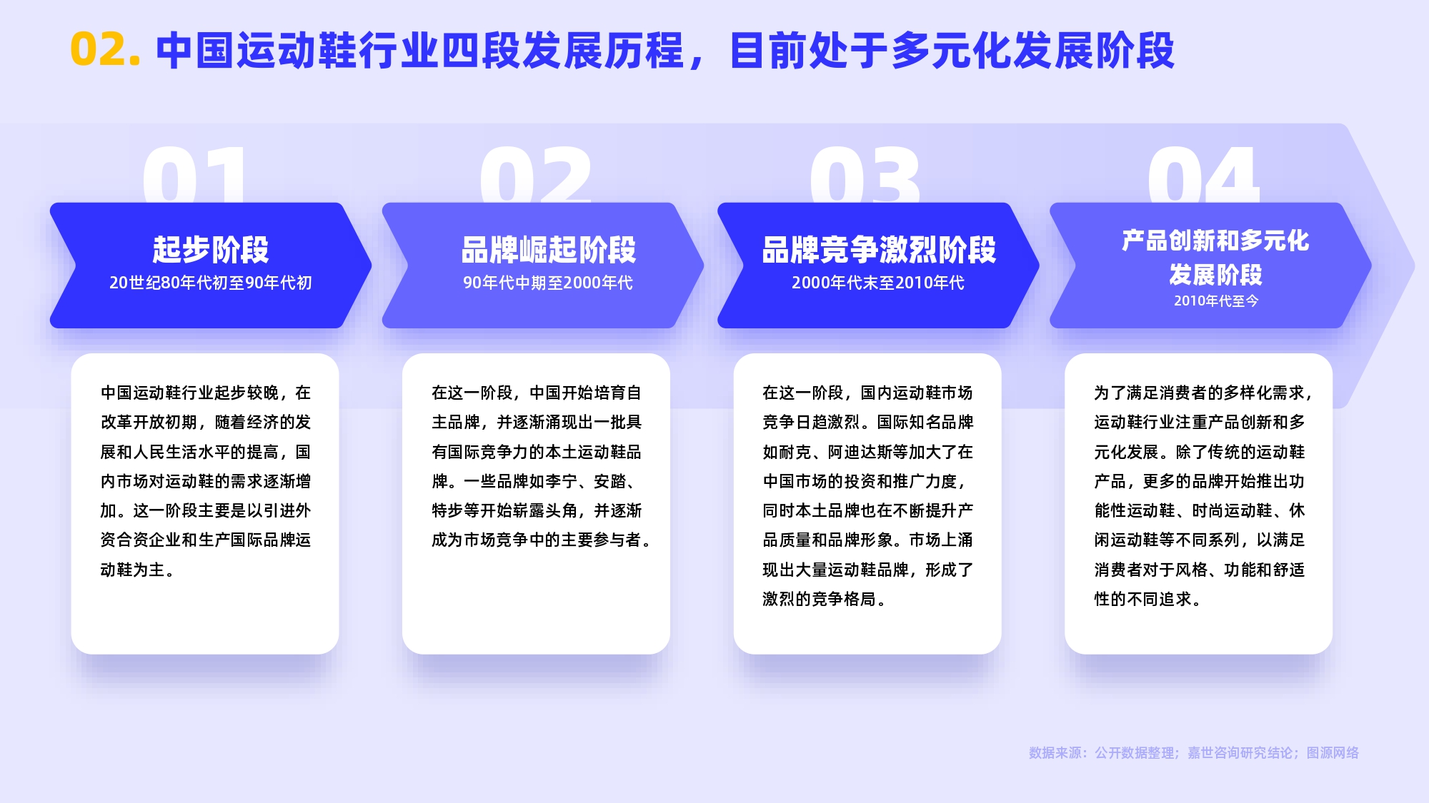 中国运动鞋行业四段发展历程:起步阶段-品牌崛起阶段-品牌竞争激烈阶段-产品创新和多元化发展阶段,目前正处于多元化发展阶段。 关于运动鞋企业,目前增长明显:广东集中度高,福建优势最为明显; 舒适性、功能性是消费者购买运动鞋最关注的因素; 大部分消费者会购买301-700元价格区间的产品; 运动鞋行业现阶段发展有什么难点?未来的发展趋势又将如何?查看完整报告获取更多细节~