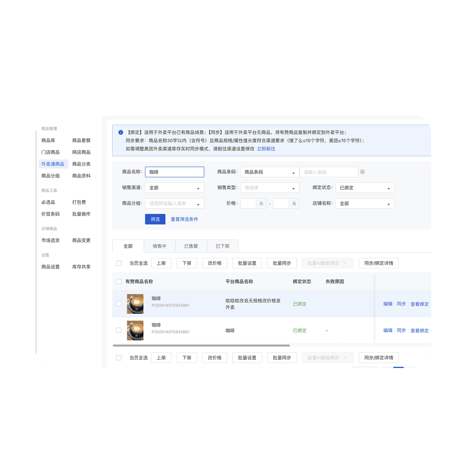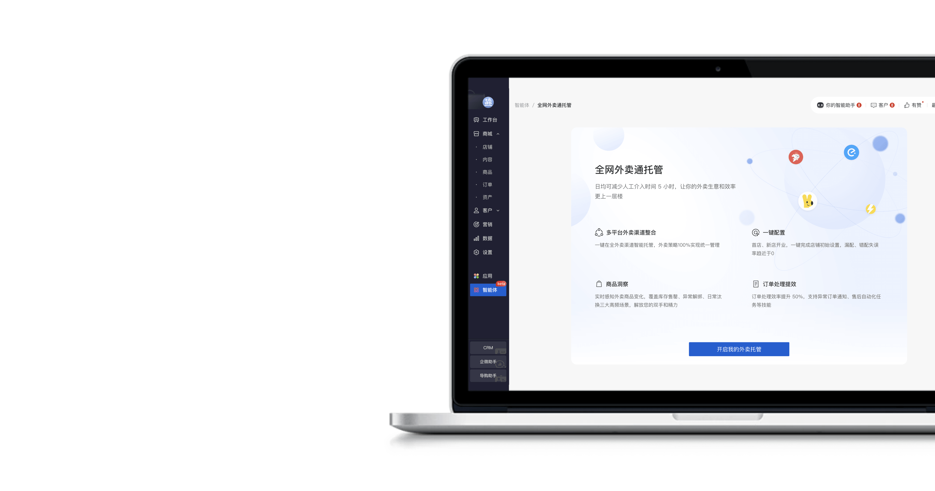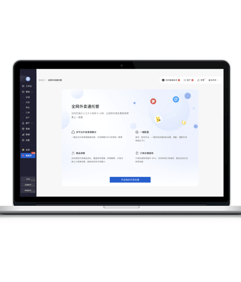 通过“全网外卖打通+智能托管+履约配送”一站式服务,帮您统一管理全渠道外卖,自动同步库存防超卖,实时优化配送效率,让外卖生意省心省力、销量持续增长!