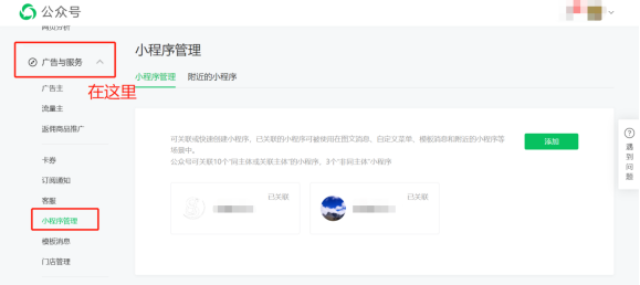 登录微信公众平台 -广告与服务 - 小程序管理-添加相关小程序。