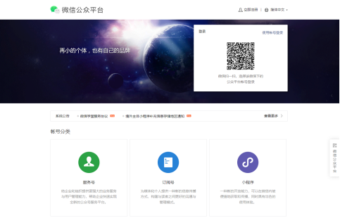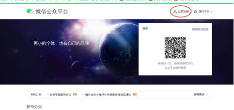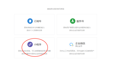 01:通过地址进入官网页面(地址:https://mp.weixin.qq.com/),这里要注意的是,如果有微信公众号了,直接可以扫码选择小程序登录;如果没有注册过任何账号,我们看02步骤