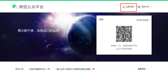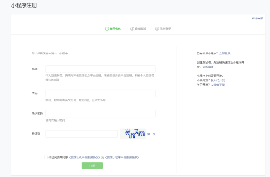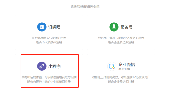 也许很多人都不清楚微信小程序平台官网的注册入口就是微信公众号注册入口,两者是同一个地址,以下4个点详解微信小程序注册入口步骤。
