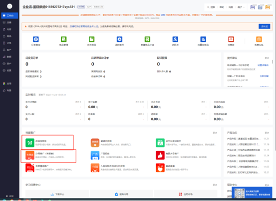 2、由于是试用的后台,基本都能都是齐全的,我们先讲解分销怎么实现。我们通过图中可以看到2.1步骤微信视频号和2.2步骤分佣推广功能(有赞客)