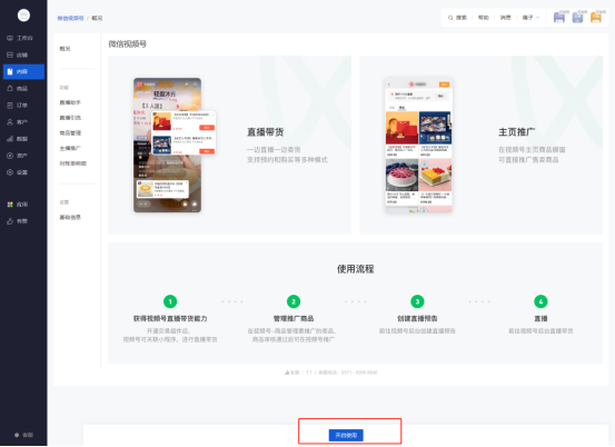2.1点击微信视频号,进入到微信视频号直播带货主题页面,我们可以看到这里可以实现视频号的直播卖货功能,但仍需要开启使用,具体步骤可以根据后台显示的步骤为准,或直接通过客服电话0571-89988848咨询