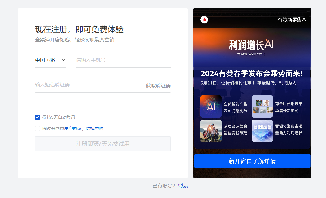 或通过登录后台,免费注册使用:https://account.youzan.com/register